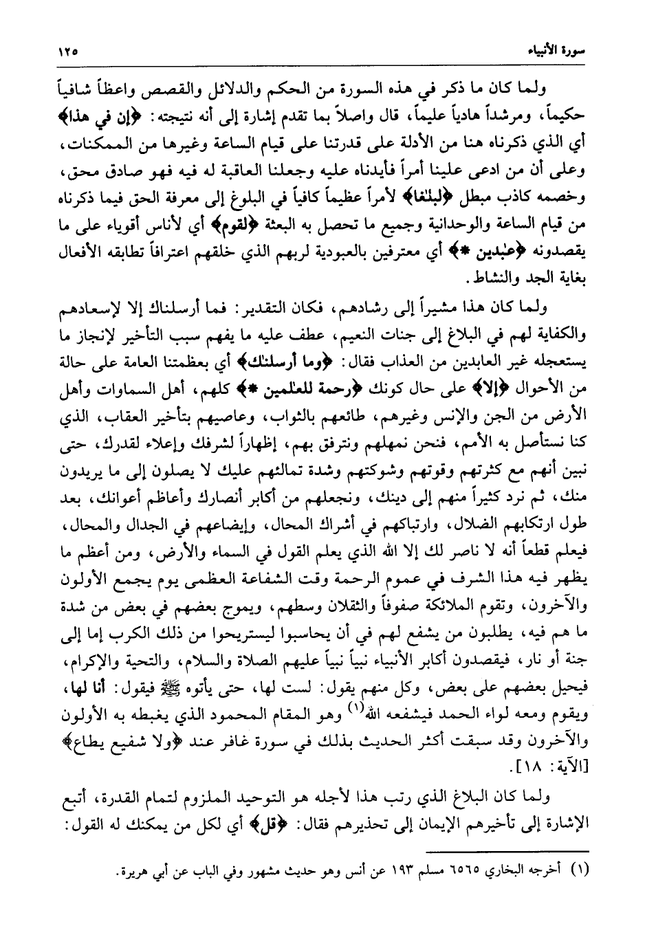 ولما كان ما ذكر في هذه السورة من الحكم والدلائل والقصص واعظاً شافياً حكيماً ، ومرشداً هادياً عليماً ، قال واصلاً بما تقدم إشارة غلى أنه نتيجة : ( إن في هذا ) أي الذي ذكرناه هنا من الأدلة على قدرتنا على قيام الساعة وغيرها من الممكنات ، وعلى أن من ادعى علينا أمراً فأيدناه عليه وجعلنا العاقبة له فيه فهو صادق محق ، وخصمه كاذب مبطل ) لبلاغاً ( لأمراً عظيماً كافياً في البلوغ إلى معرفة الحق فيما ذكرناه من قيام الساعة والوحدانية وجميع ما تحصل به البعثة ) لقوم ) أي لأناس أقوياء على ما يقصدونه ) عابدين ) أي معترفين بالعبودية لربهم الذي خلقهم اعترافاً تطابقه الأفعال بغاية الجد والنشاط .