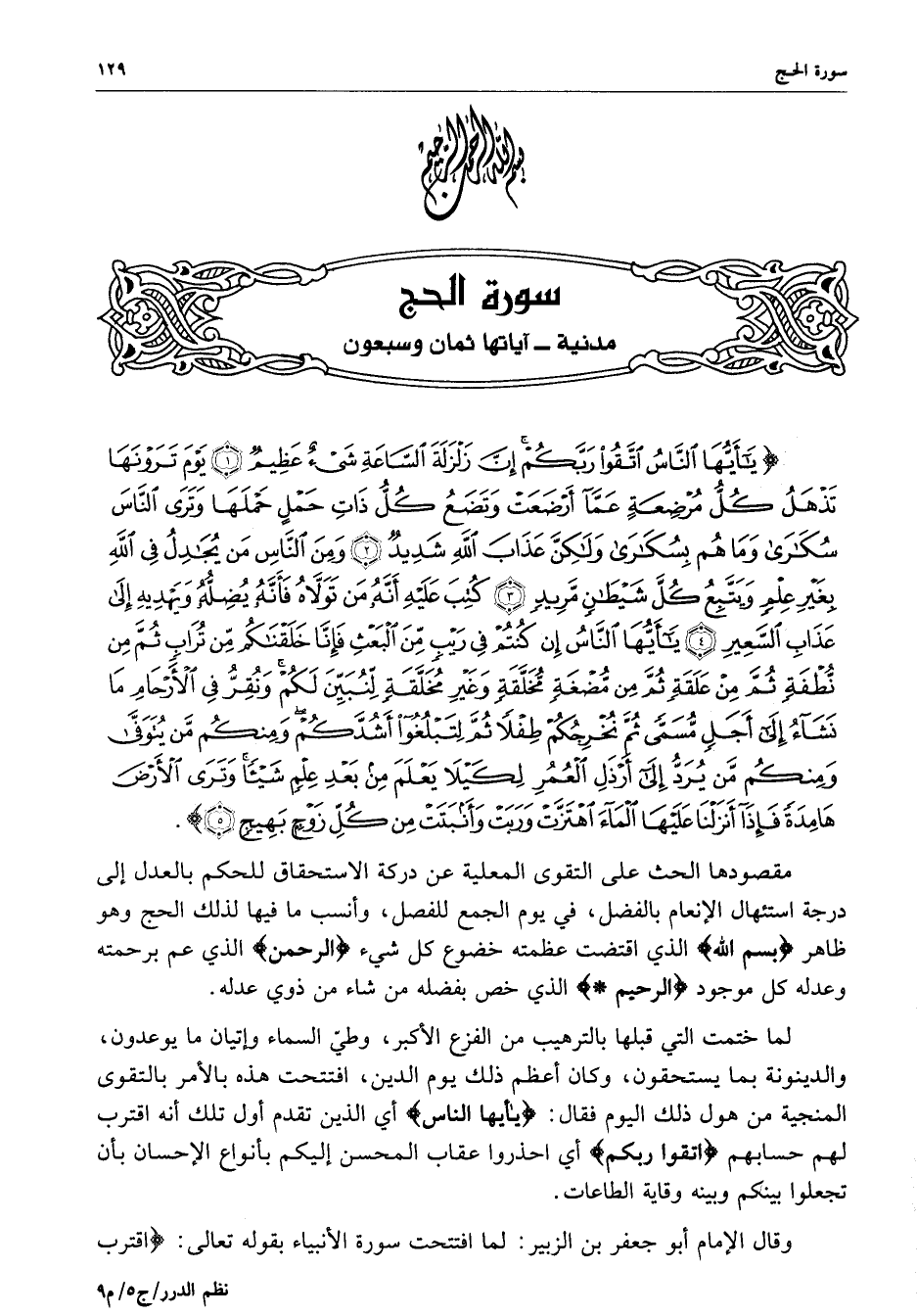 ) يأَيُّهَا النَّاسُ اتَّقُواْ رَبَّكُمْ إِنَّ زَلْزَلَةَ السَّاعَةِ شَيْءٌ عَظِيمٌ يَوْمَ تَرَوْنَهَا تَذْهَلُ كُلُّ مُرْضِعَةٍ عَمَّآ أَرْضَعَتْ وَتَضَعُ كُلُّ ذَاتِ حَمْلٍ حَمْلَهَا وَتَرَى النَّاسَ سُكَارَى وَمَا هُم بِسُكَارَى وَلَكِنَّ عَذَابَ اللَّهِ شَدِيدٌ وَمِنَ النَّاسِ مَن يُجَادِلُ فِي اللَّهِ بِغَيْرِ عِلْمٍ وَيَتَّبِعُ كُلَّ شَيْطَانٍ مَّرِيدٍ كُتِبَ عَلَيْهِ أَنَّهُ مَن تَوَلاَّهُ فَأَنَّهُ يُضِلُّهُ وَيَهْدِيهِ إِلَى عَذَابِ السَّعِيرِ يأَيُّهَا النَّاسُ إِن كُنتُمْ فِي رَيْبٍ مِّنَ الْبَعْثِ فَإِنَّا خَلَقْنَاكُمْ مِّن تُرَابٍ ثُمَّ مِن نُّطْفَةٍ ثُمَّ مِنْ عَلَقَةٍ ثُمَّ مِن مُّضْغَةٍ مُّخَلَّقَةٍ وَغَيْرِ مُخَلَّقَةٍ لِّنُبَيِّنَ لَكُمْ وَنُقِرُّ فِي الأَرْحَامِ مَا نَشَآءُ إِلَى أَجَلٍ مُّسَمًّى ثُمَّ نُخْرِجُكُمْ طِفْلاً ثُمَّ لِتَبْلُغُواْ أَشُدَّكُمْ وَمِنكُمْ مَّن يُتَوَفَّى وَمِنكُمْ مَّن يُرَدُّ إِلَى أَرْذَلِ الْعُمُرِ لِكَيْلاَ يَعْلَمَ مِن بَعْدِ عِلْمٍ شَيْئاً وَتَرَى الأَرْضَ هَامِدَةً فَإِذَآ أَنزَلْنَا عَلَيْهَا الْمَآءَ اهْتَزَّتْ وَرَبَتْ وَأَنبَتَتْ مِن كُلِّ زَوْجٍ بَهِيجٍ ( ( )