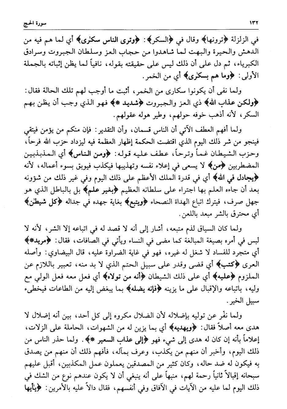 في الزلزلة ) ترونها ( وقال في ) السكر ( : ( وترى الناس سكارى ) أي لما هم فيه من الدهش والحيرة والبهت لما شاهدوا من حجاب العز وسلطان الجبروت وسرادق الكبرياء ، ثم دل على أن ذلك ليس على حقيقته بقوله ، نافياً لما يظن إثباته بالجملة الأولى : ( وما هم بسكارى ) أي من الخمر .
