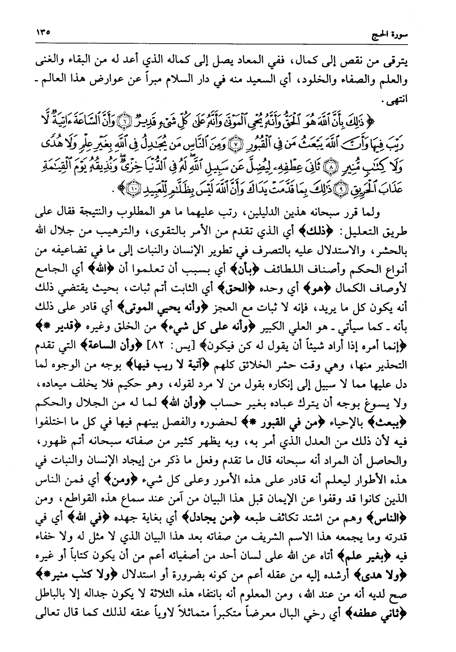 ) ذلِكَ بِأَنَّ اللَّهَ هُوَ الْحَقُّ وَأَنَّهُ يُحْيِي الْمَوْتَى وَأَنَّهُ عَلَى كُلِّ شَيْءٍ قَدِيرٌ وَأَنَّ السَّاعَةَ آتِيَةٌ لاَّ رَيْبَ فِيهَا وَأَنَّ اللَّهَ يَبْعَثُ مَن فِي الْقُبُورِ ومِنَ النَّاسِ مَن يُجَادِلُ فِي اللَّهِ بِغَيْرِ عِلْمٍ وَلاَ هُدًى وَلاَ كِتَابٍ مُّنِيرٍ ثَانِيَ عِطْفِهِ لِيُضِلَّ عَن سَبِيلِ اللَّهِ لَهُ فِي الدُّنْيَا خِزْيٌ وَنُذِيقُهُ يَوْمَ الْقِيَامَةِ عَذَابَ الْحَرِيقِ ذلِكَ بِمَا قَدَّمَتْ يَدَاكَ وَأَنَّ اللَّهَ لَيْسَ بِظَلاَّمٍ لِّلعَبِيدِ ( ( )