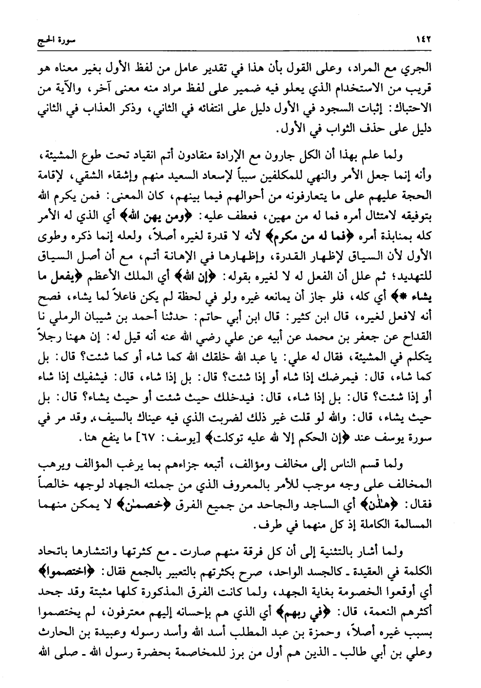 ولما أشار بالتثنية إلى كل فرقة منهم صارت - مع كثرتها وانتشارها باتحاد الكلمة في العقيدة - كالجسد الواحدن صرح بكثرتهم بالتعبير بالجمع فقال : ( اختصموا ) أي أوقعوا الخصومة بغاية الجهد ، ولما كانت الفرق المذكورة كلها مثبتة وقد جحد أكثرهم النعمة ، قال : ( في ربهم ) أي الذي هم بإحسانه إليهم معترفون ، لم يختصموا بسبب غيره أصلاً ، وحمزة بن عبد المطلب أسد الله وأسد رسوله وعبيدة بن الحارث وعلي بن أبي طالب - الذين هم أول من برز للمخاصمة بحضرة رسول الله - صلى الله