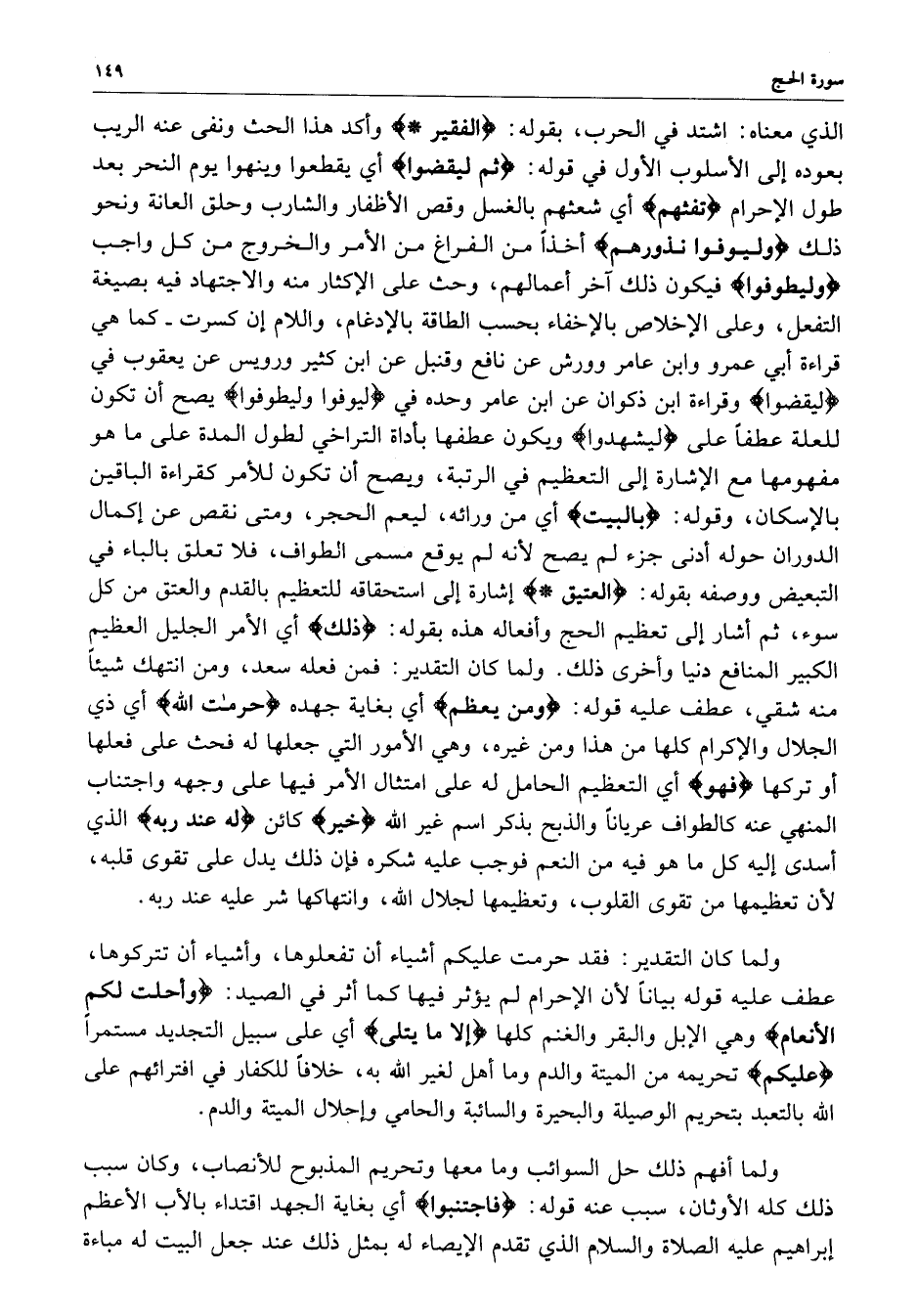 الذي معناه : اشتد في الخرب ، بقوله ) الفقير ( وأكد هذا الحث ونفى عنه الريب بعوده إلى الأسلوب الأول في قوله : ( ثم ليقضوا ) أي يقطعوا وينهوا يوم النحر بعد طول الإحرام ) تفثهم ) أي شعثهم بالغسل وقص الأظفار والشارب وحلق العنة ونحو ذلك ) وليوفوا نذورهم ( أخذاً من الفراغ من الأمر والخروج من كل واجب ) وليطوفوا ( فيكون ذلك آخر أعمالهم ، وحث على الإكثار منه والاجتهاد فيه بصيغة التفعل ، وعلى الإخلاص بالإخفاء بحسب الطاقة بالإدغام ، واللام إن كسرت - كما هي قراءة أبي عمرو وانب عامر وورش عن نافع وقنبل غن ابن كثير ورويس عن يعقوب في ) ليقضوا ( وقراءة ابن ذكوان عن ابن عامر وحده في ) ليوفوا وليطوفوا ( يصح أن تكون للعلة عطفاً على ) ليشهدوا ( ويمون عطفها بأداة التراخي لطول المدة على ما هو مفهومها مع الإشارة إلى التعظيم في الرتبة ، ويصح أن تكون للأمر كقراؤة الباقين بالإسكان ، وقوله : ( بالبيت ) أي من ورائه ، لعلم الحجر ، ومتى نقص عن إكمال الدوران حوله أدنى جزء لم يصح أنه لم يوقع مسمىى الطواف ، فلا تعلق بالباء في التبعيض ووصفه بقوله : ( العتيق ( إشارة إلى استحقاقه للتعظيم بالقدم والعتق من كل سوء ، ثم أشار غلى تعظيم الحج وأفعاله هذه بقوله : ( ذلك ) أي المر الجليل العظيم الكبير المنافع دنيا وأخرى ذلك .