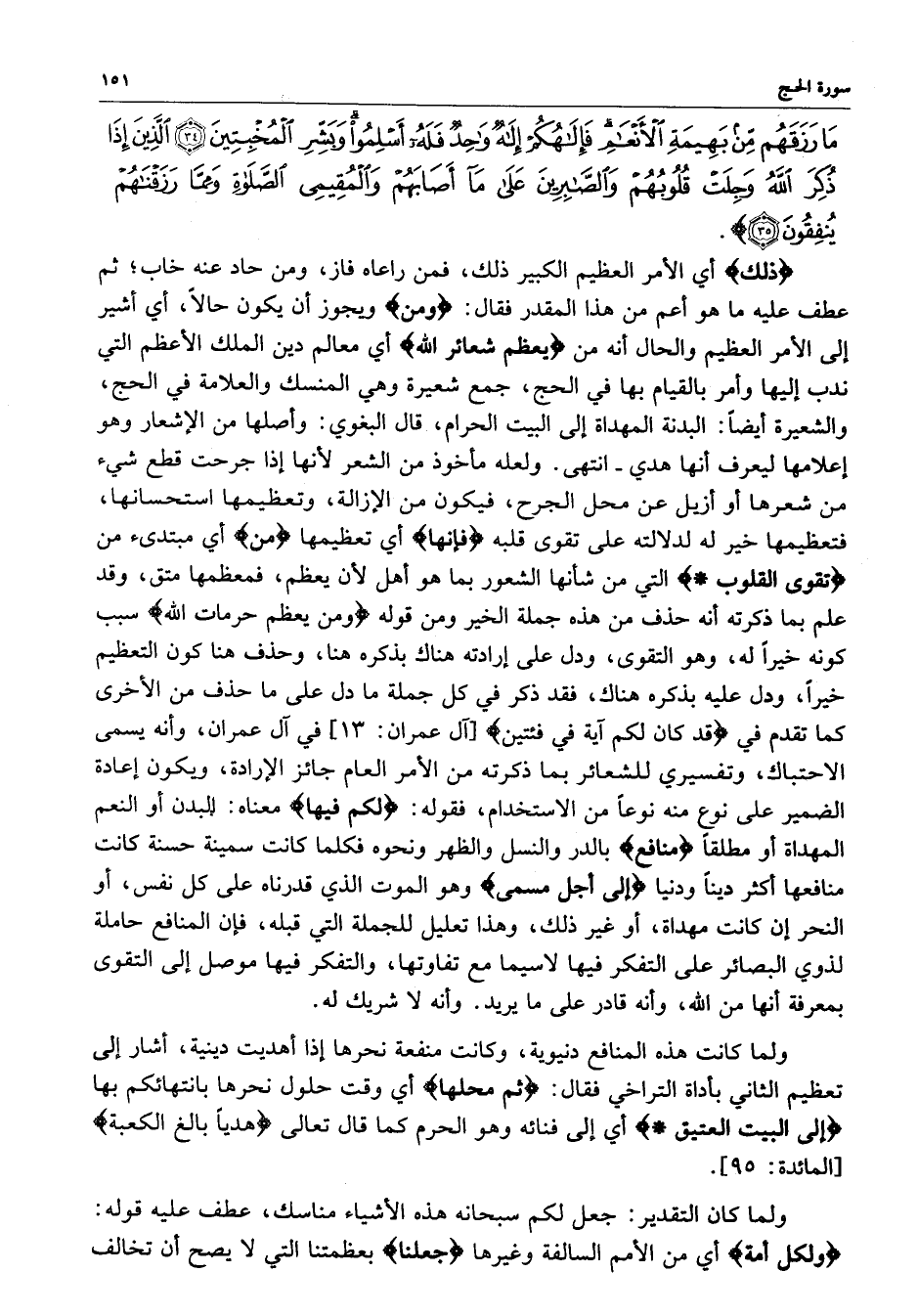 [ آل عمران : 3 ] في آل عمران ، وأنه يسمى الاحتباك ، وتفسيري للشعائر بما بما ذكرته من الأمر العام جائزا الإرادة ، ويكون إعادة الضمير على نوع منه نوعاً من الاستخدام ، فقوله : ( لكم فيها ( مهناه : البدن أو النعم المهداة أو مطلقاً ) منافع ( بالدر والنسل والظهر ونحوه فكلما كانت سمينة حسنة كانت منافعها أكثر ديناً ودنيا ) إلى أجل مسمى ( وهو الموت الذي قدرناه على كل نفس ، أو النحر إن كانت مهداة ، أو غير ذلك ، وهذا تعليل للجملة التي قبله ، فإن المنافع حاملة لذوي البصائر على التفكر فيها لا سيمت مع تفاوتها ، والتفكر فيها موصل إلى التقوى بمعرفة أنها من الله ، وأنه قادر على ما يريد .