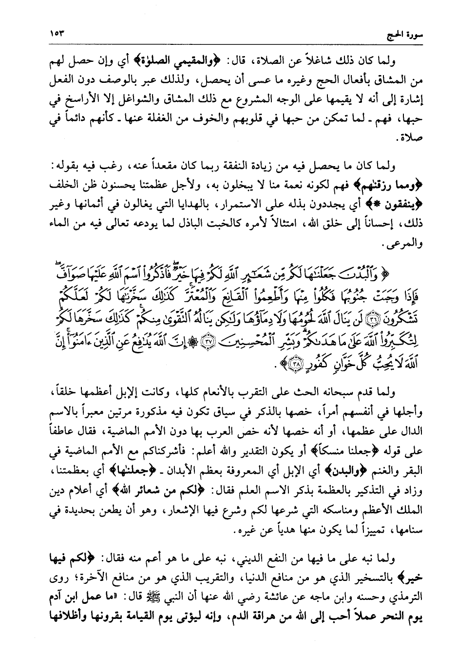 ) وَالْبُدْنَ جَعَلْنَاهَا لَكُمْ مِّن شَعَائِرِ اللَّهِ لَكُمْ فِيهَا خَيْرٌ فَاذْكُرُواْ اسْمَ اللَّهِ عَلَيْهَا صَوَآفَّ فَإِذَا وَجَبَتْ جُنُوبُهَا فَكُلُواْ مِنْهَا وَأَطْعِمُواْ الْقَانِعَ وَالْمُعْتَرَّ كَذلِكَ سَخَّرْنَاهَا لَكُمْ لَعَلَّكُمْ تَشْكُرُونَ لَن يَنَالَ اللَّهَ لُحُومُهَا وَلاَ دِمَآؤُهَا وَلَكِن يَنَالُهُ التَّقْوَى مِنكُمْ كَذلِكَ سَخَّرَهَا لَكُمْ لِتُكَبِّرُواْ اللَّهَ عَلَى مَا هَدَاكُمْ وَبَشِّرِ الْمُحْسِنِينَ إِنَّ اللَّهَ يُدَافِعُ عَنِ الَّذِينَ آمَنُواْ إِنَّ اللَّهَ لاَ يُحِبُّ كُلَّ خَوَّانٍ كَفُورٍ ( ( )