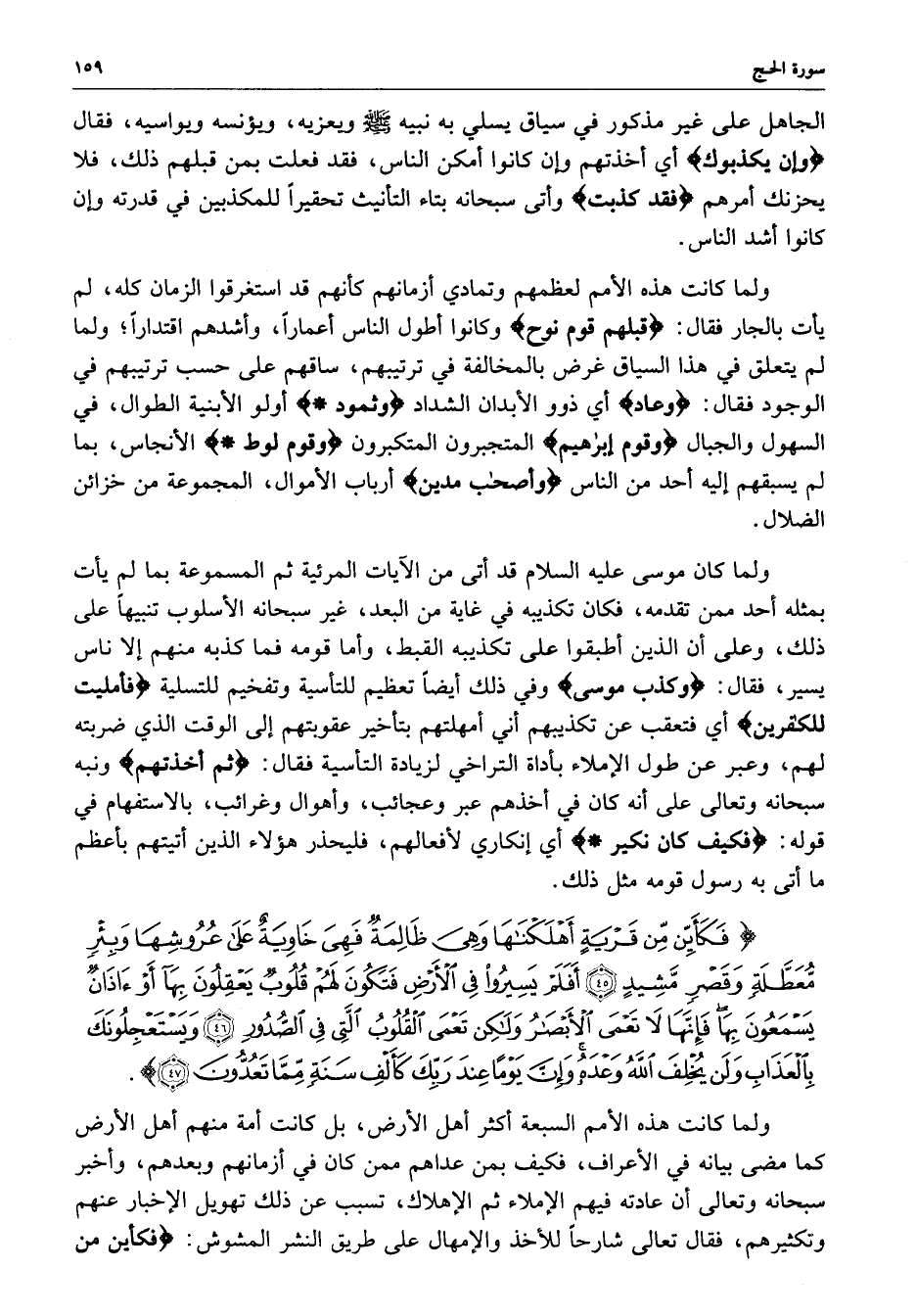 ) فَكَأَيِّن مِّن قَرْيَةٍ أَهْلَكْنَاهَا وَهِيَ ظَالِمَةٌ فَهِيَ خَاوِيَةٌ عَلَى عُرُوشِهَا وَبِئْرٍ مُّعَطَّلَةٍ وَقَصْرٍ مَّشِيدٍ أَفَلَمْ يَسِيرُواْ فِي الأَرْضِ فَتَكُونَ لَهُمْ قُلُوبٌ يَعْقِلُونَ بِهَآ أَوْ آذَانٌ يَسْمَعُونَ بِهَا فَإِنَّهَا لاَ تَعْمَى الأَبْصَارُ وَلَكِن تَعْمَى الْقُلُوبُ الَّتِي فِي الصُّدُورِ وَيَسْتَعْجِلُونَكَ بِالْعَذَابِ وَلَن يُخْلِفَ اللَّهُ وَعْدَهُ وَإِنَّ يَوْماً عِندَ رَبِّكَ كَأَلْفِ سَنَةٍ مِّمَّا تَعُدُّونَ ( ( )