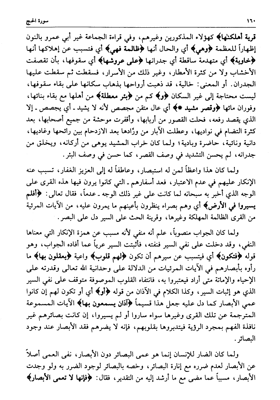 قرية أهلكناها ( كهؤلاء المذكورين وغيرهم ، وفي قراءة الجماعة غير أبي عمرو بالنون إظهاراً للعظمة ) وهي ) أي والحال أنها ) ظالمة فهي ) أي فتسبب عن إهلاكها أنها ) خاوية ) أي متهدمة ساقطة أي جدرانها ) على عروشها ) أي سقوفها ، بأن تقصفت الأخشاب ولا من كثرة الأمطار ، وغير ذلك من الأسرار ، فسقطت ثم سقطت عليها الجدران .