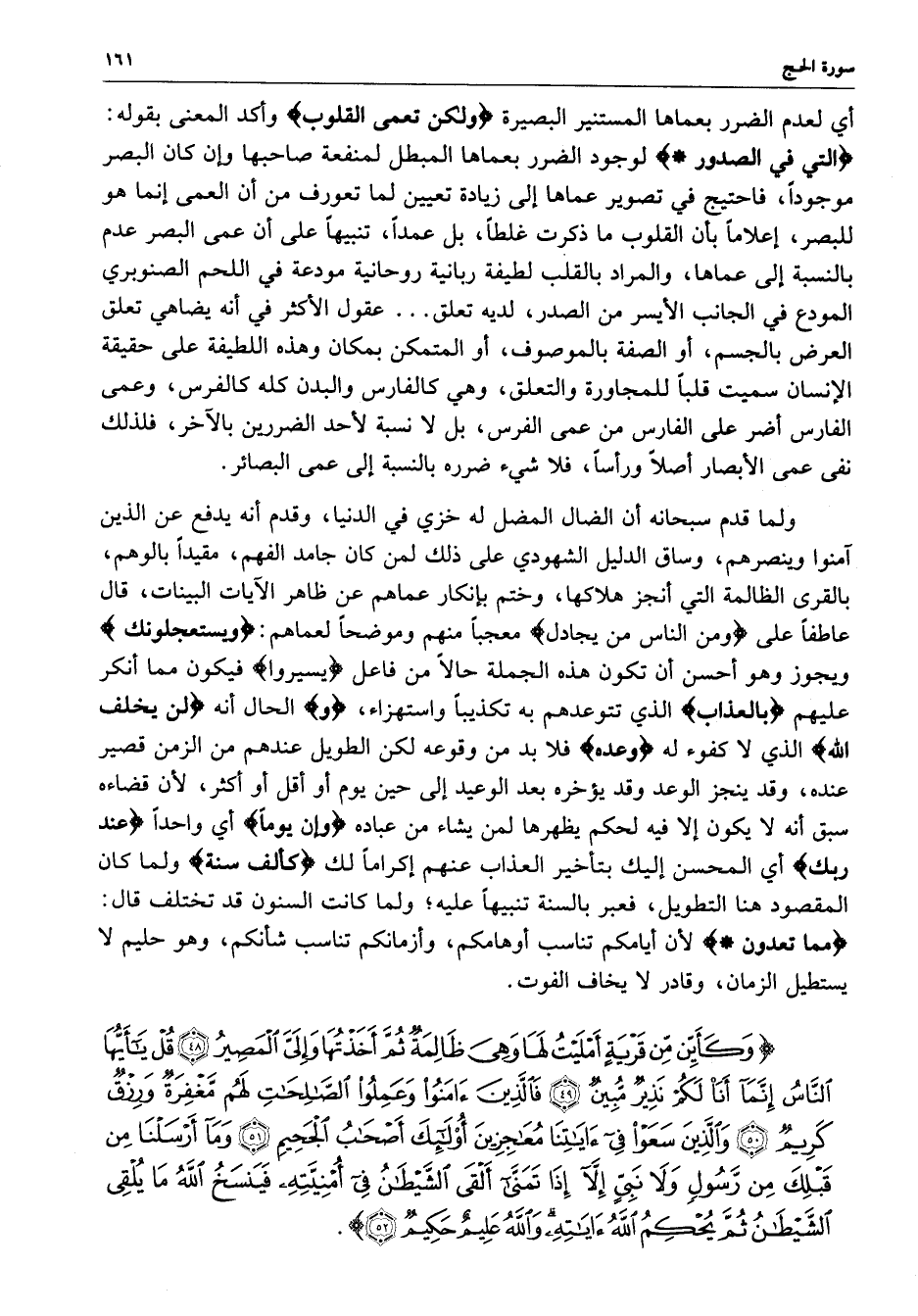 أي لعدم الضرر بعماها المستنير البصيرة ) ولكن نعمى القلوب ( ، اكد المعنى بقوله : ( التي في الصدور ( لوجود الضرر بعماها المبطل لمنفعة صاحبها وإن كان البصر موجداً ، فاحتيج في تصوي عماها إلى زيادة تعيين لما تعورف من أن العمى البصر عدم للبصر ، إعلاماً بأن القلوب ما ذكرت غلطاً ، بل عمداً ، تنبيهاً على أن عمى البصر عدم بالنسبة لى عماها ، والمراد بالقلب لطيفة ربانية روحانية مودعة في اللحم الصنوبري المودع في الجانب الأيسر من الصدر ، لديه تعلق. . .