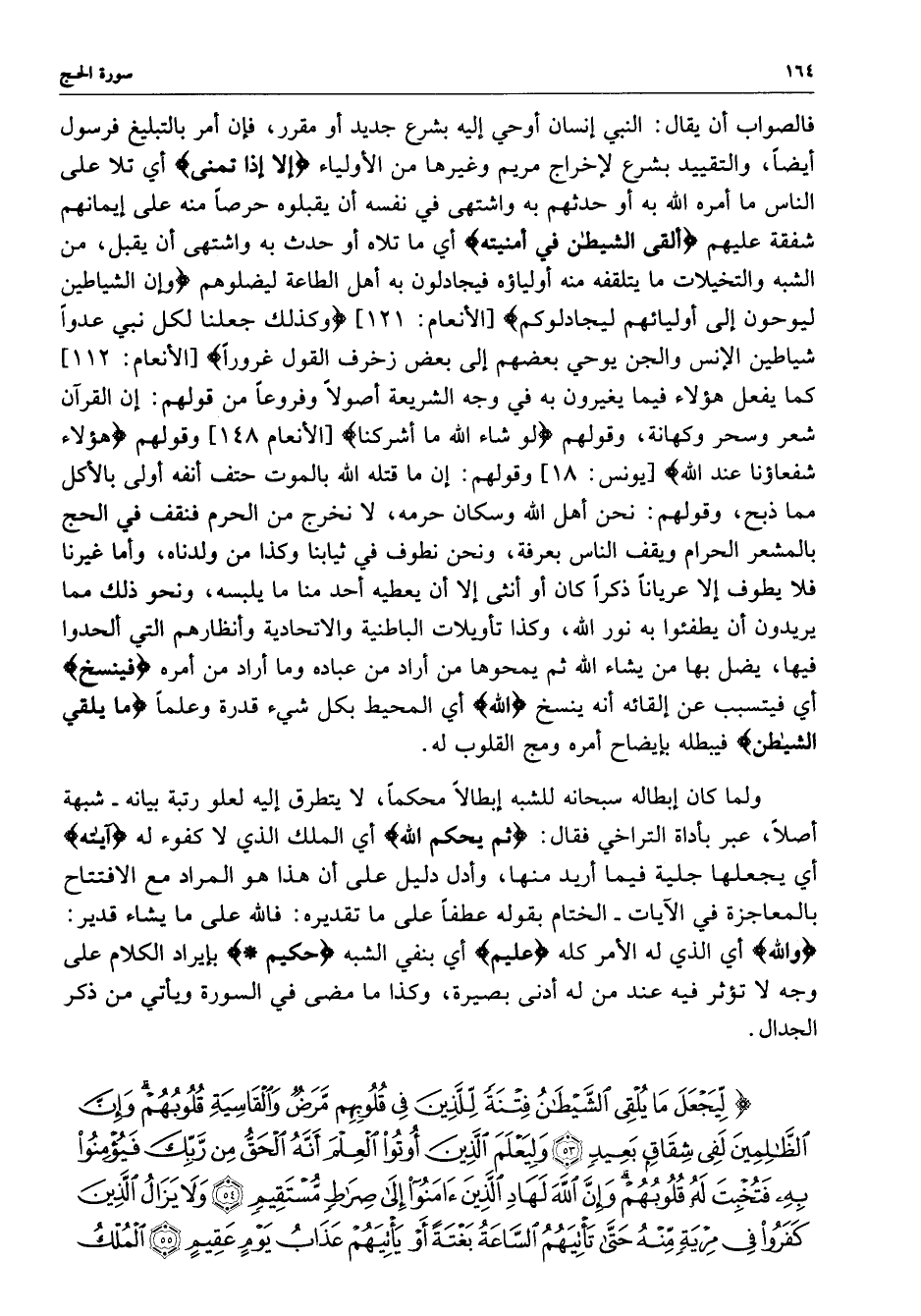 فالصواب أن يقال : أن النبي إنسان أوحي إليه بشرع جديد أو مقرر ، فإن أمر بالتبليغ فرسول أيضاً ، والتقييد بشرع لأخراج مريم وغيرها من الأولياء ) إلا إذا تمنى ) أي تلا على الناس ما أمره الله به أو حدثهم به واشتهى في نفسه أن يقبلوه حرصاً منه على إيمانهم شفقة عليهم ) القى الشيطان في أمنيته ) أي ما تلاه أو حدث به ةاشتهى أن يقبل ، من الشبه والتخيلات ما يتلقفه منه أولياءه فيجادلون به أهل الطاعة ليضلوهم ) ) وإن الشياطين ليوحون إلى أوليائهم ليجادلوكم ( ) [ النعام : 121 ] ) ) وكذلك جلعنا لكل نبي عدواً شياطين الإنس والجن يوحي بعضهم إلى بعض زخرف القول غروراً ( ) [ الأنعام : 112 ] كما يفعل هؤلاء فيما يغيرون به في وجه الشريعة اصولاً وفروعاً من قولهمك إن القرآن شعر وسحر وكهانة ، وقولهم ) ) لو شاء الله ما أشركنا ( ) [ الأنعام 148 ] وقولهم ) ) هؤلاء شفعاؤنا عند الله ( ) [ يونس : 18 ] وقولهم ك إن ما قلته الله بالموت حتف أنفه أولى بالأكل مما ذبح ، وقولهمك نحن أهل الله وسكان حرمهن لا نخرج من الحرم فنقف في الحج بالمعشر الحرام ويقف الناس بعرفة ، ونحن نطوف قي ثيابنا وكذا من ولدناه ، وأما غيرنا فلا يطوف إلا عرياناً ذكراً ان أو أنثى إلا أن يعطيه أحد منا ما يلبسه ، نحو ذلك مما يريدون أن يطفئوا به نور الله ، وكذا تأويلات الباطنية والاتحادية وأنظارهم التي ألحدو فيها ، يضل بها من يشاء الله ثم يمحوها من أراد من عباده وما أراد من أمره ) فينسخ ) أي فيتسبب عن إلقائه أنه ينسخ ) الله ( اي المحيط بكل شيء قدرة وعلماً ) ما يلقي الشيطان ( فيبطله بإيضاح أمره ومج القلوب له .