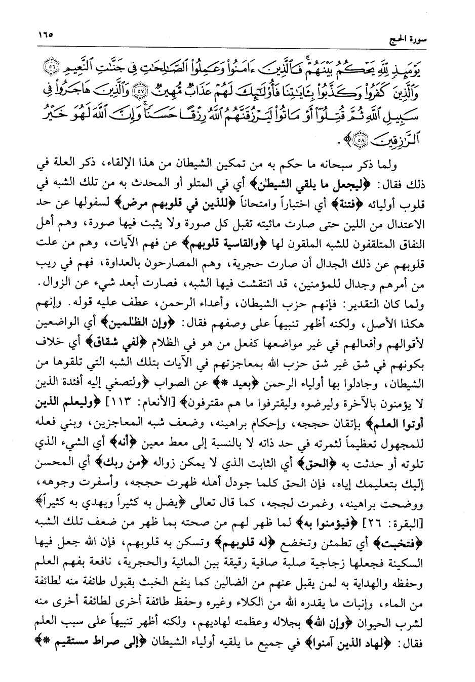 ولما ذكر سبحانه ما حكم به من تمكين الشيطان من هذا الإلقاء ، ذكر العلة في ذلك فقال : ( ليجعل ما يلقي الشيطان ( اي في المتلو أو المحدث به من تلك الشبه في قلوب أوليائه ) فتنة ) أي اختبار وامتحاناً ) للذين في قلوبهم مرض ( لسفولها عن حد الاعتدال من اللين حتى صارت مائيتة تقبل كل صورة ولا يثبت فيها صورة ، وهم أهل النفاق المتلقفون للشبه الملقون لها ) والقاسية قلوبهم ( عن فهم الآيات ، وهم من علت قلوبهم عن ذلك الجدال أن صارت حجرية ، وهم المصارحون بالعداوة ، فهم في ريب من أمرهم وجدال للمؤمنين ، قد انتشقت فيها الشبه ، فصارت أبعد شيء عن الزوال .