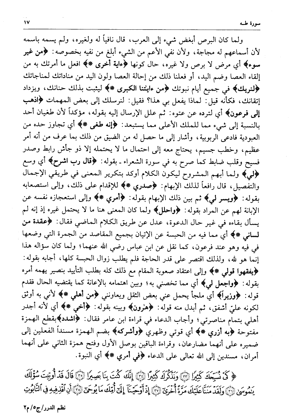 ولما كان البرص أبغض شيء إلى العرب ، نافياٍ له ولغيره ، ولم يسمه باسمه أن أسماعهم له مجاجة ، ولأن نفي الأعم من الشيء أبلغ من نفيه بخصوصه : ( من غير سوء ) أي مرض لا برص ولا غيره ، حال كونها ) ءاية أخرى ( افعل ما أمرتك به من إلقاء العصا وضم اليد ، أو فعلنا ذلك من إحالة العصا واون اليد من مناداتك لناجاتك ) لنرينك ( في جميع أيام نبوتك ) من ءايتنا الكبرى ( ليثبت بذلك حنانك ، ويزداد إتقانك ، فكأنه قيل : لماذا يفعل بي هذا ؟ فقيل : لنرسلك إلى بعض المهمات ) اذهب إلى فرعون ) أي لترده عن عتوه : ثم علل الإرسال إلية بقوله مؤكداً لأن طغيان أحد بالنسبة إلى شيء مما للملك الأعلى مما يستبعد : ( إنه طغى ) أي تجاوز حده من العبودية فادعى الربوبية ، وأشار إلى ما حصل له من الضيق من ذلك بما عرف من أنه أمر عظيم ، وخطب جسيم ، يحتاج معه إلى احتمال ما لا يحتمله إلا ذو جأش رابط وصدر فسيح قلب ضابط كما صرح به في سورة الشعراء - بقوله ) قال رب اشرح ) أي وسع ) لي ( ولما أبهم المشروح ليكون الكلام أوكد بتكرير المعنى في طريقي الإجمال والتفصيل ، قال رافعاً لذلك الإبهام : ( صدري ( للإقدام على ذلك ، وإلى استصعابه بقوله : ( ويسر لي ( ثم بين ذلك الإبهام بقوله : ( أمري ( وإلى اتعجازه نفسه عن الإبانة لهم عن المراد بقوله : ( واحلل ( ولما كان المعنى هنا ما لا يحتمل غيره إذ إنه لم يسأل بقاءه في غير حال الدعوة ، عدل عن طريق الكالم الماضي فقال : ( عقدة من لساني ) أي مما فيه من الحبسة عن الإتيان بجميع المقاصد من الجمرة التي وضعها في فيه وهو عند فرعون ، كما نقل عن ابن عباس رضي الله عنهما ، ولما كان سؤاله هذا إنما هو الله ، ولذلك اقتصر على قدر الحاجة فلم يطلب زوال الحبسة كلها ، أجابه بقوله : ( يفقهوا قولي ( وإلى اعتقاد صعوبة المقام مع ذلك كله بطلب التأييد بنصير يهمه أمره بقوله : ( واجعل لي ) أي مما تخصني به ؛ وبين اهتمامه بالإعانة كما يقتضيه الحال فقدم قوله : ( وزيراً ) أي ملجأ يحمل عني بعض الثقل ويعاونني ) من أهلي ( أني به أوثق لكونه عليّ أشفق ، ثم أبدل منه قوله : ( هرون ( وبينه بقوله : ( أخي ) أي لأنه أجدر أهلي بتمام مناصرتي ؛ وأجاب الدعاء في قراءة ابن عامر فقال : ( اشدد ( بقطع الهمزة مفتوحة ) به أزري ) أي قوتي وظهري ) وأشركه ( بضم الهمزة مسنداً الفعلين إلى ضميره على أنهما مضارعان ، وقراءة الباقين بوصل الأول وفتح الثاني على أنهما أمران مسندين إلى الله تعالى على الدعاء ) في أمري ) أي النبوة .