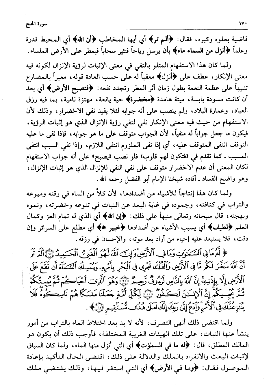 ) للَّهُ مَا فِي السَّمَاوَاتِ وَمَا فِي الأَرْضِ وَإِنَّ اللَّهَ لَهُوَ الْغَنِيُّ الْحَمِيدُ أَلَمْ تَرَ أَنَّ اللَّهَ سَخَّرَ لَكُم مَّا فِي الأَرْضِ وَالْفُلْكَ تَجْرِي فِي الْبَحْرِ بِأَمْرِهِ وَيُمْسِكُ السَّمَآءَ أَن تَقَعَ عَلَى الأَرْضِ إِلاَّ بِإِذْنِهِ إِنَّ اللَّهَ بِالنَّاسِ لَرَءُوفٌ رَّحِيمٌ وَهُوَ الَّذِي أَحْيَاكُمْ ثُمَّ يُمِيتُكُمْ ثُمَّ يُحْيِيكُمْ إِنَّ الإِنْسَانَ لَكَفُورٌ لِّكُلِّ أُمَّةٍ جَعَلْنَا مَنسَكاً هُمْ نَاسِكُوهُ فَلاَ يُنَازِعُنَّكَ فِي الأَمْرِ وَادْعُ إِلَى رَبِّكَ إِنَّكَ لَعَلَى هُدًى مُّسْتَقِيمٍ ( ( )