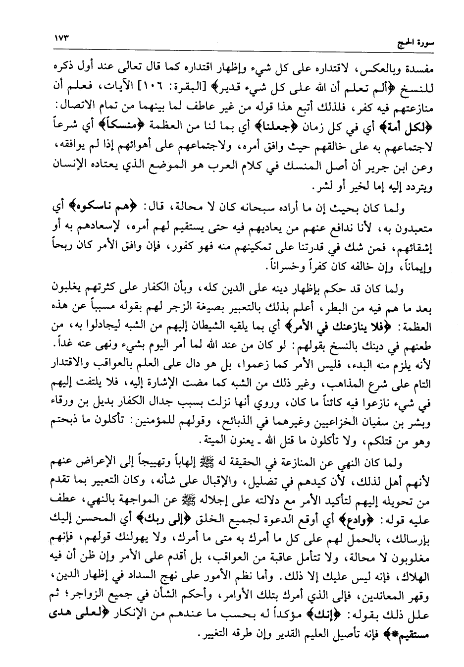 [ البقرة : 106 ] الآياتن فعلم أن منازعتهم فيه كفر ، فلذلك أتبع هذا قوله من غير عاطف لما بينهما من تمام الاتصال : ( لكل أمة ) أي في كل زمان ) جعلنا ) أي بما لنا من العظمة ) منسكاً ) أي شرعاً لاجتماعهم به على خالقهم حيث وافق أمره ، ولاجتماعهم على أهوائهم إذا لم يوافقه ، وعن ابن جرير أم أصل المنسك في كلام العرب هو الموضع الذي يعتاده الإنسان ويتردد إليه إما لخير أو لشر .