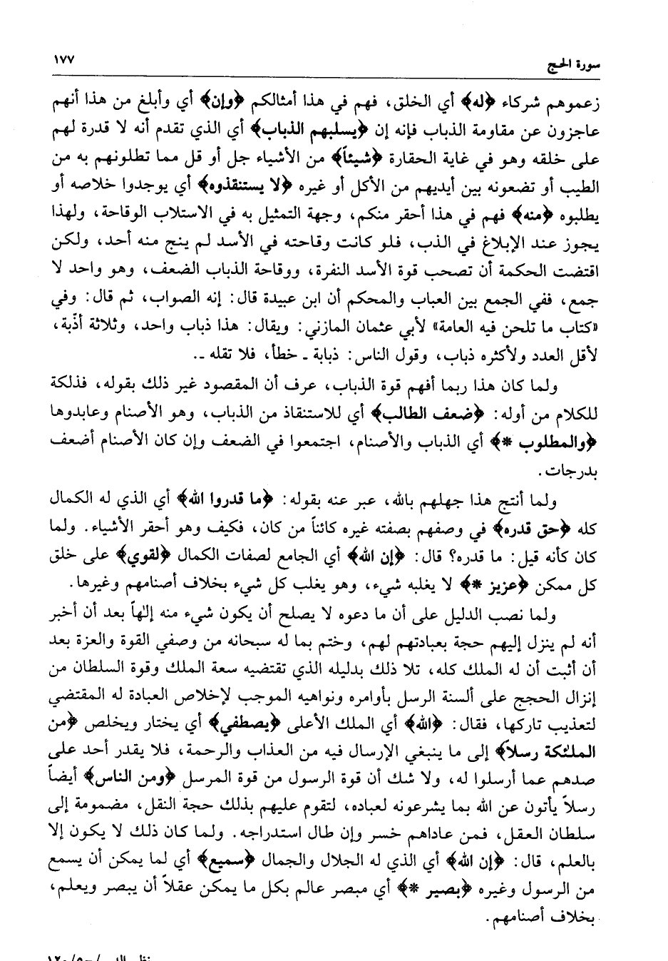 زعموهم شركاء ) له ) أي الخلق ، فهم في هذا أمثالكم ) وإن ) أي وأبلغ من هذا أنهم عاجزون عن مقاومة الذباب فإنه إن ) يسلبهم الذباب ) أي الذي تقدم أنه لا قدرة لهم على خلقه وهو في غاية الحقارة ) شيئاً ( من الأشياء جل أو قل مما تطلونهم به من الطيب أو تضعونه بين ايديهم من الأكل أوغيره ) لا يستنقذوه ) أي يوجدوا خلاصه أو يطلبونه ) منه ( فهم في هذا أحقر منكم ، وجهة التمثيل به في الاستلاب الوقاحة ، ولهذا يجوز عند الإبلاغ في الذب ، فلو كانت وقاحته في الأسد لم ينج منه أحد ، ولكن اقتضت الحكمة أن تصحب قوة الأسد النفرة ، ووقاحة الذباب الضعف ، وهو واحد لا جمع ، ففي الحمع بين العباب والمحكم أن عبيدة قال : إنه الصواب ، ثم قال : وفي ( كتاب ما تلحن فيه العامة ) لأبي عثمان المازني : ويقال : هذا ذباب واحد ، وثلاثة أذّبة ، لأقل العدد ولأكثر ذباب ، وقول الناس : ذبابة - خطأ ، فلا تقله - .