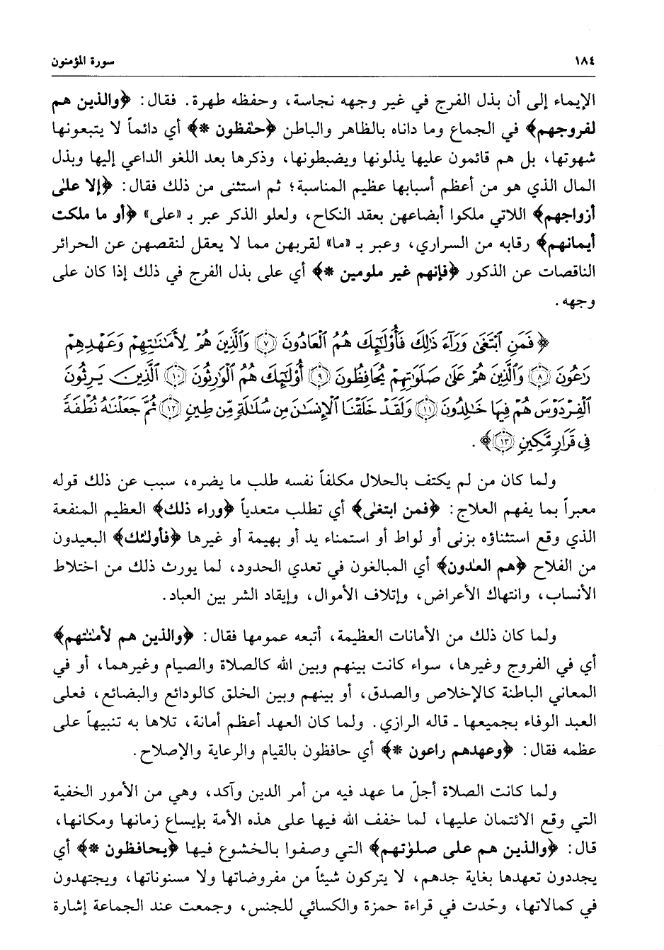 ) فَمَنِ ابْتَغَى وَرَآءَ ذلِكَ فَأُوْلَئِكَ هُمُ الْعَادُونَ وَالَّذِينَ هُمْ لأَمَانَاتِهِمْ وَعَهْدِهِمْ رَاعُونَ وَالَّذِينَ هُمْ عَلَى صَلَوَاتِهِمْ يُحَافِظُونَ أُوْلَئِكَ هُمُ الْوَارِثُونَ الَّذِينَ يَرِثُونَ الْفِرْدَوْسَ هُمْ فِيهَا خَالِدُونَ وَلَقَدْ خَلَقْنَا الإِنْسَانَ مِن سُلاَلَةٍ مِّن طِينٍ ثُمَّ جَعَلْنَاهُ نُطْفَةً فِي قَرَارٍ مَّكِينٍ ( ( )