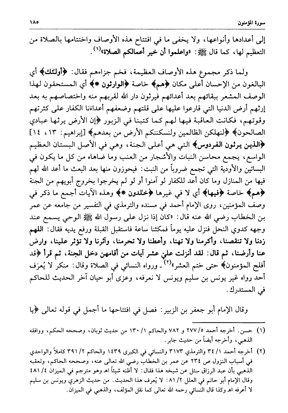 [ إبراهيم : 13 ، 14 ] ) الذين يرثون الفردوس ( التي هي أعلى الجنة ، وهي في الأصل البستان العظيم الواسع ، يجمع محاسن النبات والأشجار من العنب وما ضاهاه من كل ما يكون في البساتين والأودية التي تجمع ضروباً من النبت : فيحوزون منها بعد البعث ما أعد الله لهم فيها من المنازل وما كان أعد للكفار لو آمنوا أو لم يخرجوا بخروج ابويهم من الجنة ) هم ( خاصة ) فيها ) أي لا في غيرها ) خالدون ( وهذه الآيات أجمع ما ذكر في وصف المؤمنين ، روى الإمام أحمد في مسنده والترميذي في التفسير من جامعه عن عمر بن الخطاب رضي الله عنه قال : ( كان إذا نزل على رسول الله ( صلى الله عليه وسلم ) الوحي يسمع عند وجهه كدوي النحل فنزل عليه يوماً فمكثنا ساعة فاستقبل القبلة ورفع فقال : ( اللهم زدنا ولا تنقصنا ، وأكرمنا ولا تهنا ، وأعطنا ولا تحرمنا ، وآثرنا ولا تؤثر علينا ، وارض عنا وأرضنا ، ثم قال : لقد أنزلت عليّ عشر آيات من أقامهن دخل الجنة ( ، ثم قرأ ) قد أفلح المؤمنون ( حتى ختم العشر ) - ورواه النسائي في الصلاة وقال : منكر لا يُعرَف أحد رواه غير يونس بن سليم ويونس لا نعرفه ، وعزى أبو حيان آخر الحديث للحاكم في المستدرك .