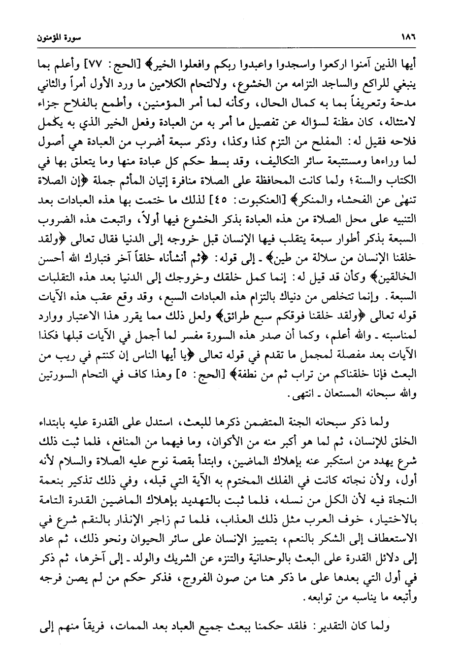 [ العنكبوت : 45 ] لذلك ما ختمت بها هذه العبادات بعد التنبيه على محل الصلاة من هذه العبادة بذكر الخشوع فيها أولاً ، واتبعت هذه الضروب السبعة بذكر أطوار سبعة يتقلب فيها الإنسان قبل خروجه إلى الدنيا فقال تعالى ) ولقد خلقنا الإنسان من سلالة من طين ( - إلى قوله : ( ثم أنشأناه خلقاً آخر فتبارك الله أحسن الخالقين ( وكأن قد قيل له : إنما كمل خلقك وخروجك إلى الدنيا بعد عقب هذه الايات قوله تعالى ) ولقد خلقنا فوقكم سبع طرائق ( ولعل ذلك مما يقرر هذا الاعتبار ووارد لمناسبته - والله أعلم ، وكما أن صدر هذه السورة مفسر لما أجمل في الآيات قبلها فكذا الآيات بعد مفصلة لمجمل ما تقدم في قوله تعالى
