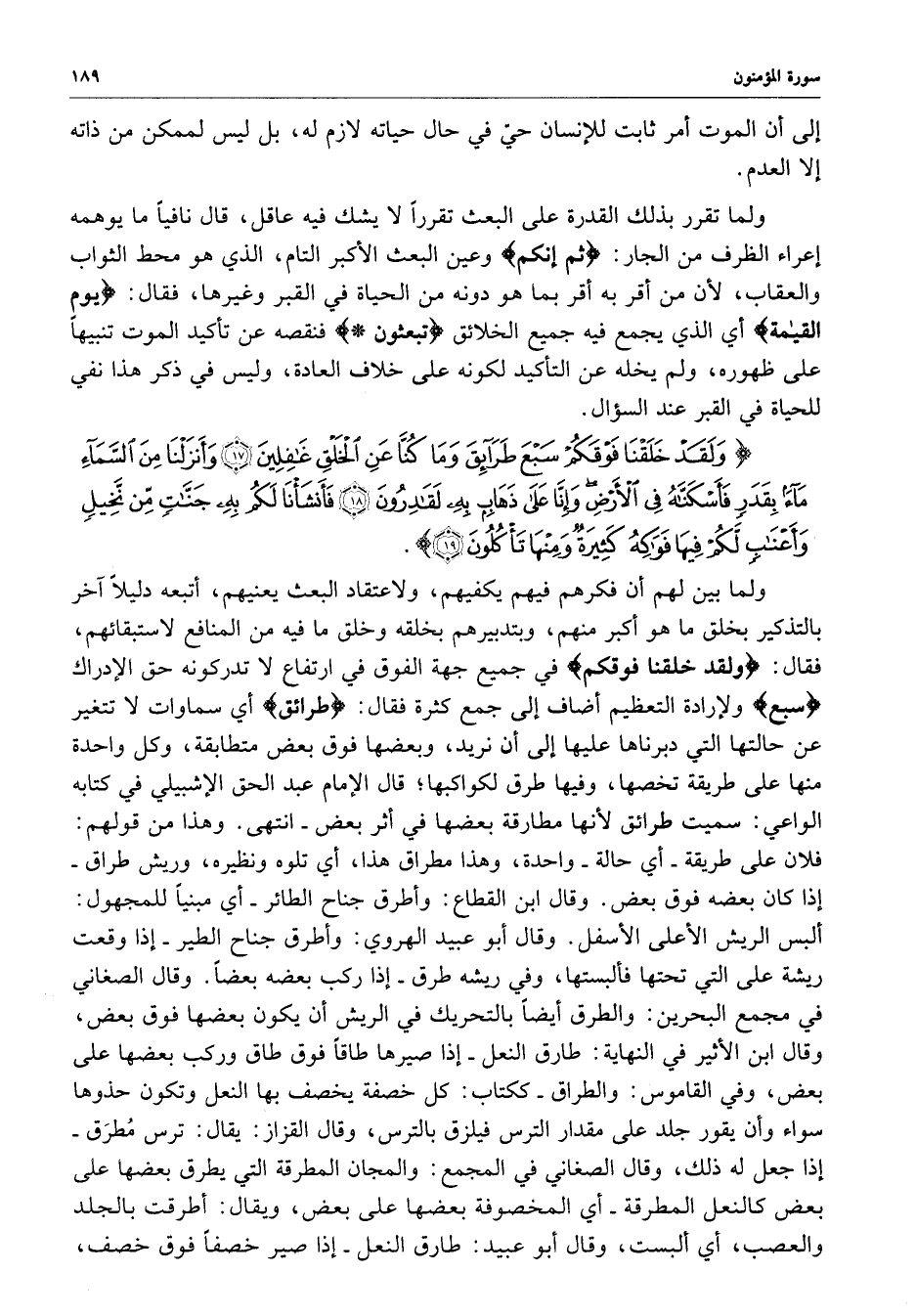) وَلَقَدْ خَلَقْنَا فَوْقَكُمْ سَبْعَ طَرَآئِقَ وَمَا كُنَّا عَنِ الْخَلْقِ غَافِلِينَ وَأَنزَلْنَا مِنَ السَّمَآءِ مَآءً بِقَدَرٍ فَأَسْكَنَّاهُ فِي الأَرْضِ وَإِنَّا عَلَى ذَهَابٍ بِهِ لَقَادِرُونَ فَأَنشَأْنَا لَكُمْ بِهِ جَنَّاتٍ مِّن نَّخِيلٍ وَأَعْنَابٍ لَّكُمْ فِيهَا فَوَاكِهُ كَثِيرَةٌ وَمِنْهَا تَأْكُلُونَ ( ( )