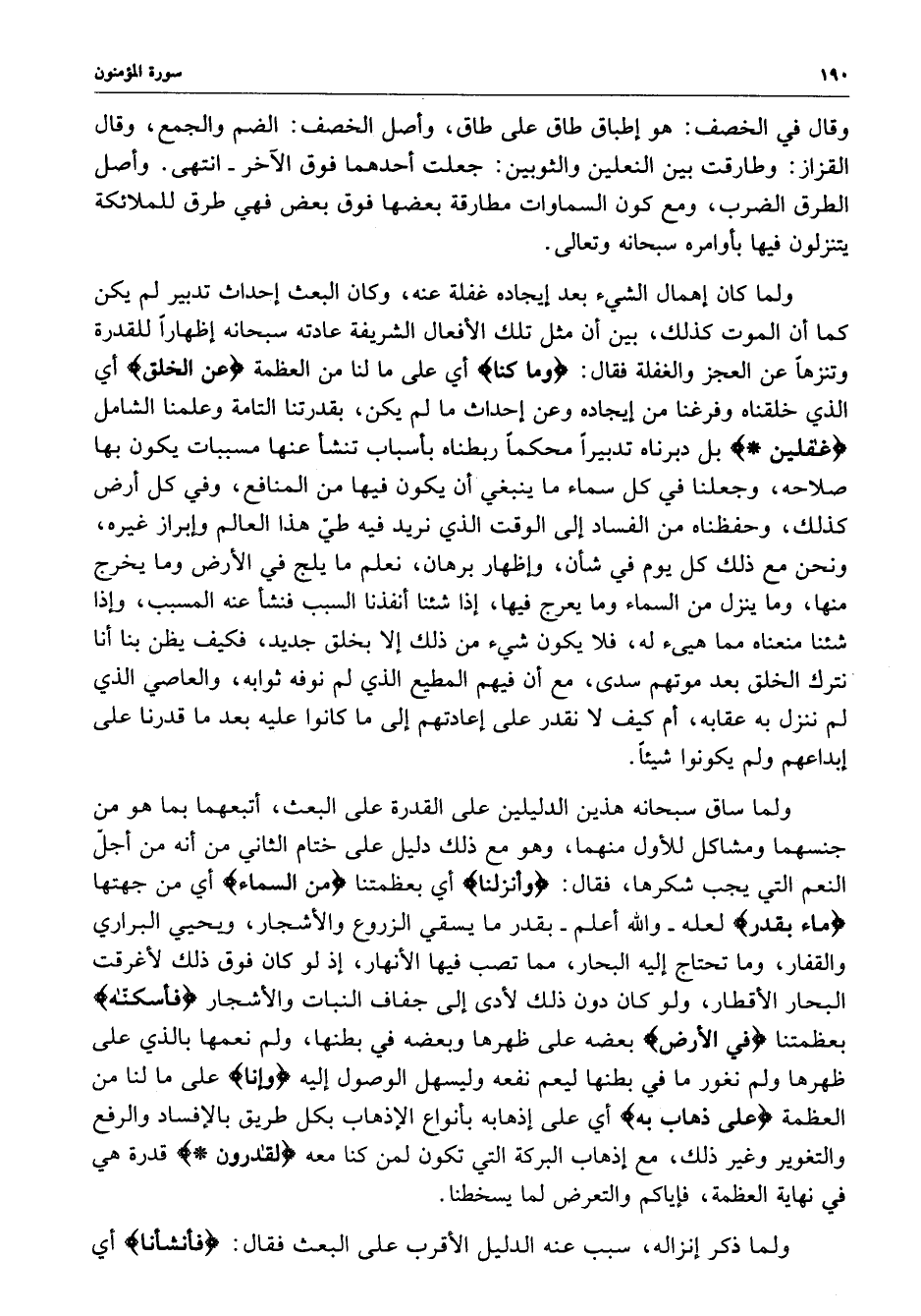 ولما ساق سبحانه هذين الدليلين على القدرة على البعث ، أتبعهما بما هو من جنسهما ومشاكل للأول منهما ، وهو مع ذلك دليل على ختام الثاني من أنه من أجلّ النعم التي يجب شكرها ، فقال : ( وأنزلنا ( اي بعظمتنا ) من السماء ) أي من جهتها ) ماء بقدر ( لعله - والله أعلم - بقدر ما يسقي الزروع والشجار ، ويحيي البراري والقفار ، وما تحتاج إليه البحار ، مما تصب فيه الأنهار ، إذ لو كان فوق ذلك لأغرقت البحار الأقطار ، ولو كان دون ذلك لأدى إلى جفاف النبات والأشجار ) فأسكنّاه ( بعظمتنا ) في الرض ( بعضه على ظهرها وبعضه في بطنها ، ولم نعمها بالذي على ظهرها ولم نغور ما في بطنها ليعم نفعه وليسهل الوصول إليه ) وإنا ( على ما لنا من العظمة ) على ذهاب به ) أي على إذهابه بأنواع الإذهاب بكل طريق بالإفساد والرفع والتغوير وغير ذلك ، مع إذهاب البركة التي تكون لمن كنا نمعه ) لقادرون ( قدرة هي في نهاية العظمة ، فإياكم والتعرض لما يسخطنا .