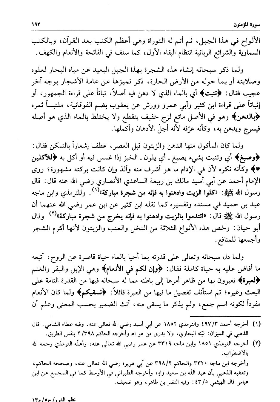 ولما ذكر سبحانه إنشاء هذه الشجرة بهذا الجبل البعيد عن مياه ابحار لعلوه وصلابته أو بما حوله من الأرض الحارة ، ذكر تميزها عن عامة الأشجار بوجه آخر عجيب فقال : ( تنبت ) أي بالماء الذي لا دهن فيه أصلاً ، نباتاً على قراءة الجمهور ، أو إنباتاً على قراءة ابن كثير وأبي عمرو وورش عن يعقوب بضم الفوقانية ، ملتبساً ثمره ) بالدهن ( وهو في الأصل مائع لزج خفيف يتقطع ولا يختلط بالماء الذي هو أصله فيسرج ويدهن به ، وكأنه عرّفه لأنه أجلّ الأدهان وأكملها .