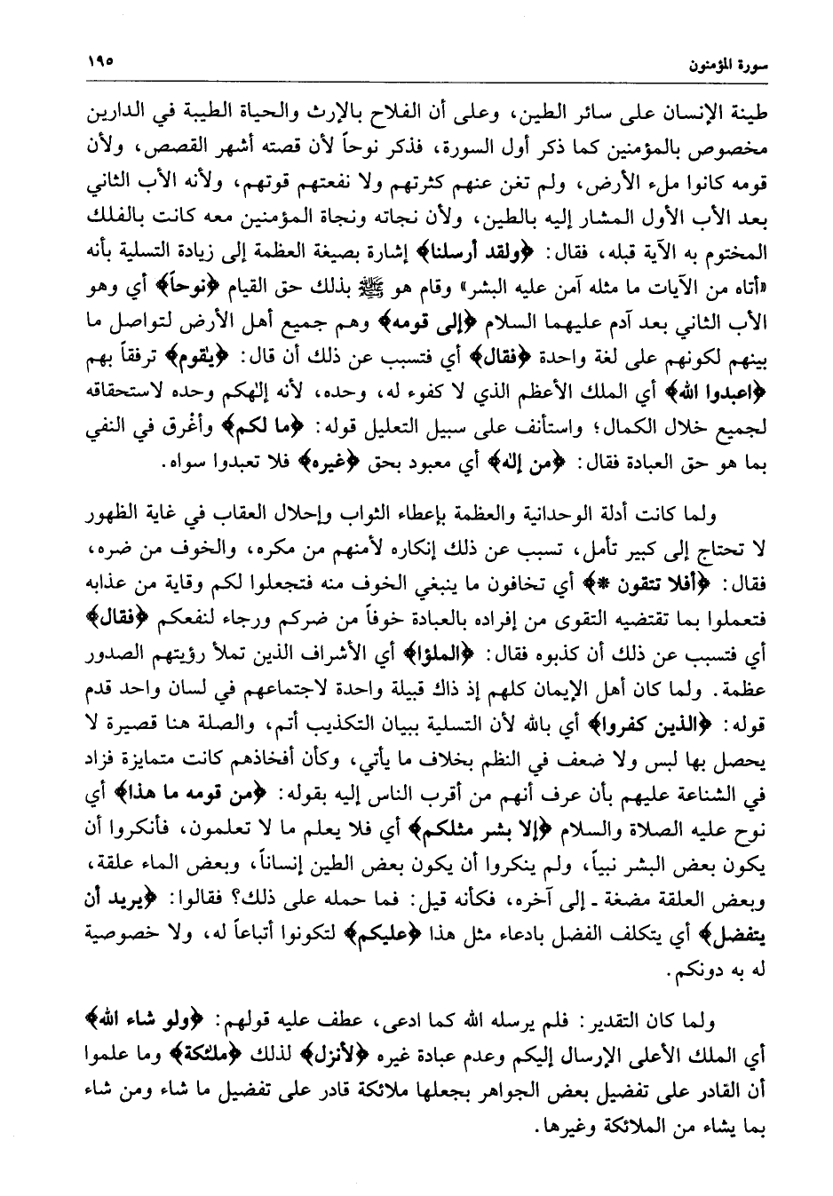 ولما كان أهل الإيمان كلهم إذ ذاك قبيلة واحدة لاجتماعهم في لسان واحد قدم قوله : ( الذين كفروا ) أي بالله لأن التسلية ببيان التكذيب أتم ، والصلة هنا قصيرة لا يحصل بها لبس ولا ضعف في النظم بخلاف ما يأتي ، وكأن أفخاذهم كانت متمايزة فزاد في الشناعة عليهم بأن عرف أنهم من أقرب الناس إليه بقوله : ( من قومه ما هذا ) أي نوح عليه الصلاة والسلام ) إلا بشر مثلكم ) أي فلا يعلم ما لا تعلمون ، فأنكروا أن يكون بعض البشر نبياً ، ولم ينكروا أن يكون بعض الطين إنساناً ، وبعض الماء علقة ، وبعض العلقة مضغة - إلى آخره ، فكأنه قيل : فما حمله على ذلك ؟ فقالوا : ( يريد أن يتفضل ( اي يتكلف الفضل بادعاء مثل هذا ) عليكم ( لتكونوا أتباعاً له ، ولا خصوصية له به دونكم .