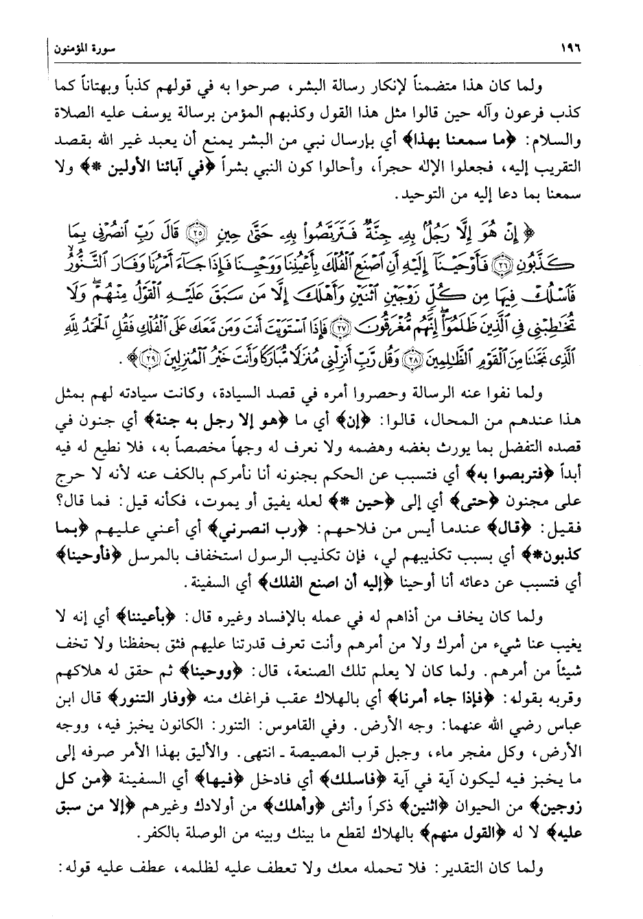 ) إِنْ هُوَ إِلاَّ رَجُلٌ بِهِ جِنَّةٌ فَتَرَبَّصُواْ بِهِ حَتَّى حِينٍ قَالَ رَبِّ انصُرْنِي بِمَا كَذَّبُونِ فَأَوْحَيْنَآ إِلَيْهِ أَنِ اصْنَعِ الْفُلْكَ بِأَعْيُنِنَا وَوَحْيِنَا فَإِذَا جَآءَ أَمْرُنَا وَفَارَ التَّنُّورُ فَاسْلُكْ فِيهَا مِن كُلٍّ زَوْجَيْنِ اثْنَيْنِ وَأَهْلَكَ إِلاَّ مَن سَبَقَ عَلَيْهِ الْقَوْلُ مِنْهُمْ وَلاَ تُخَاطِبْنِي فِي الَّذِينَ ظَلَمُواْ إِنَّهُمْ مُّغْرَقُونَ فَإِذَا اسْتَوَيْتَ أَنتَ وَمَن مَّعَكَ عَلَى الْفُلْكِ فَقُلِ الْحَمْدُ للَّهِ الَّذِي نَجَّانَا مِنَ الْقَوْمِ الظَّالِمِينَ وَقُل رَّبِّ أَنزِلْنِي مُنزَلاً مُّبَارَكاً وَأَنتَ خَيْرُ الْمُنزِلِينَ ( ( )