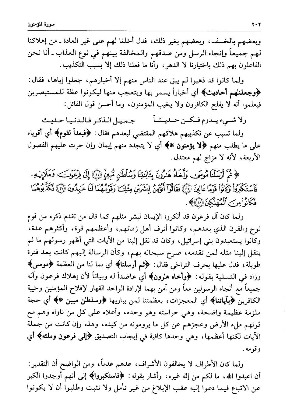) ثُمَّ أَرْسَلْنَا مُوسَى وَأَخَاهُ هَارُونَ بِآيَاتِنَا وَسُلْطَانٍ مُّبِينٍ إِلَى فِرْعَوْنَ وَمَلَئِهِ فَاسْتَكْبَرُواْ وَكَانُواْ قَوْماً عَالِينَ فَقَالُواْ أَنُؤْمِنُ لِبَشَرَيْنِ مِثْلِنَا وَقَوْمُهُمَا لَنَا عَابِدُونَ فَكَذَّبُوهُمَا فَكَانُواْ مِنَ الْمُهْلَكِينَ ( ( )