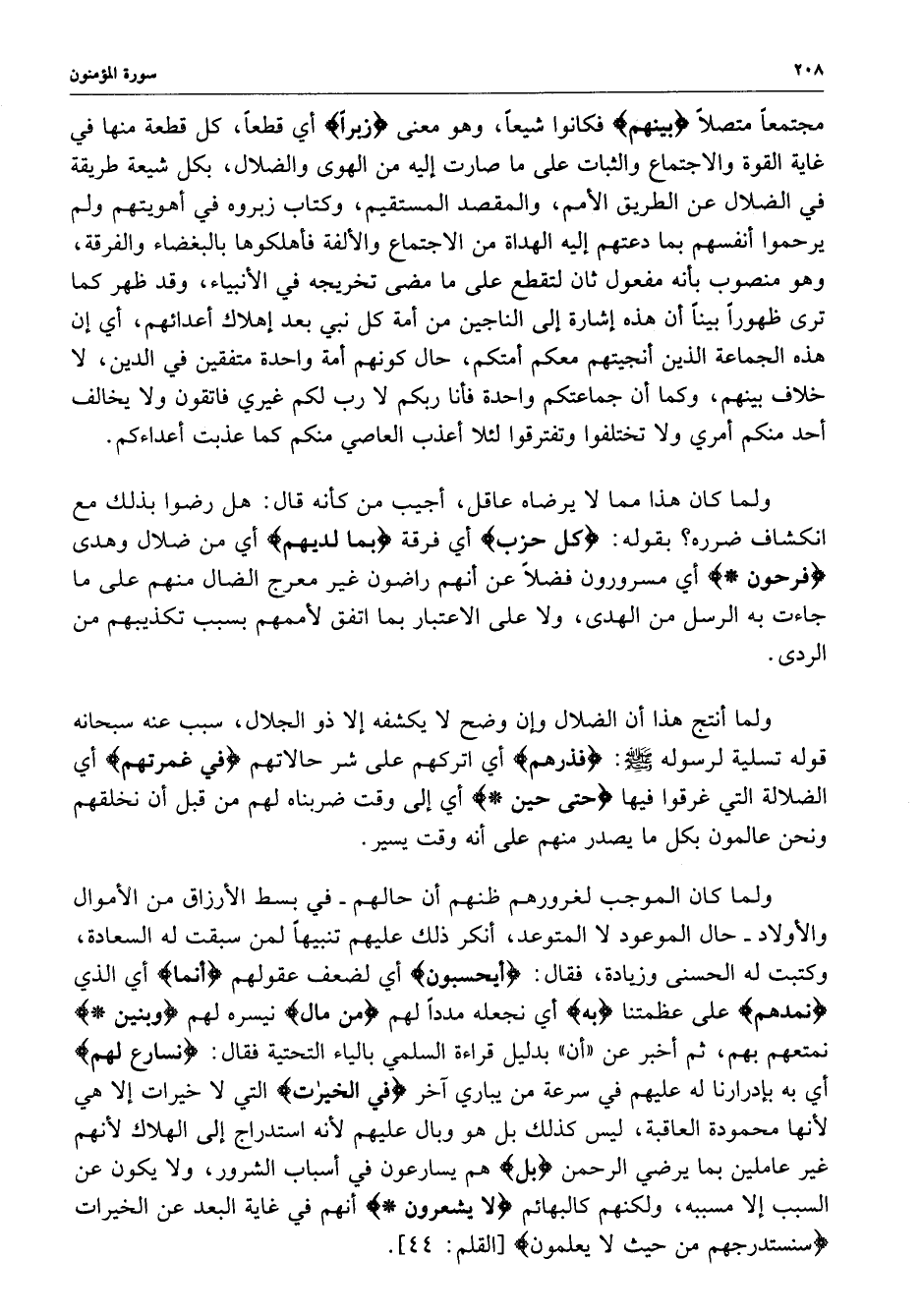 مجتمعاً متصلاً ) بينهم ( فكانوا شيعاً ، وهو معنى ) زبراً ) أي قطعاً ، كل قطعة منها في غاية القوة والاجتماع والثبات على ما صارت إليه من الهوى والضلال ، بكل شيعة طريقة في الضلال عن الطريق الأمم ، والمقصد المستقيم ، وكتاب زبروه في أهويتهم ولم يرحموا أنفسهم بما دعتهم إليه الهداة من الاجتماع والألفة فأهلكوها بالبغضاء والفرقة ، وهو منصوب بأنه مفعول ثان لتقطع على ما مضى تخريجه في الأنبياء ، وقد ظهر كما ترى ظهوراً بيناً أن هذه غشارة إلى الناجين من أمة كل نبي بعد إهلاك أعدائهمن اي أن هذه الجماعة الذين أنجيتهم معكم أمتكم ، حال كونهم أمة واحدة متفقين في الدين ، لا خلاف بينهم ، وكما أن جماعتكم واحدة فإنا ربكم لا رب لكم غيري فاتقون ولا يخالف أحد منكم أمري ولا تختلفوا لئلا أعذب العاصي منكم كما عذبت أعداءكم .