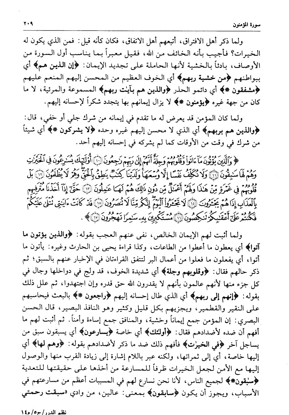 ) وَالَّذِينَ يُؤْتُونَ مَآ آتَواْ وَّقُلُوبُهُمْ وَجِلَةٌ أَنَّهُمْ إِلَى رَبِّهِمْ رَاجِعُونَ أُوْلَئِكَ يُسَارِعُونَ فِي الْخَيْرَاتِ وَهُمْ لَهَا سَابِقُونَ وَلاَ نُكَلِّفُ نَفْساً إِلاَّ وُسْعَهَا وَلَدَيْنَا كِتَابٌ يَنطِقُ بِالْحَقِّ وَهُمْ لاَ يُظْلَمُونَ بَلْ قُلُوبُهُمْ فِي غَمْرَةٍ مِّنْ هَذَا وَلَهُمْ أَعْمَالٌ مِّن دُونِ ذلِكَ هُمْ لَهَا عَامِلُونَ حَتَّى إِذَآ أَخَذْنَا مُتْرَفِيهِمْ بِالْعَذَابِ إِذَا هُمْ يَجْأَرُونَ لاَ تَجْأَرُواْ الْيَوْمَ إِنَّكُمْ مِّنَّا لاَ تُنصَرُونَ قَدْ كَانَتْ آيَاتِي تُتْلَى عَلَيْكُمْ فَكُنتُمْ عَلَى أَعْقَابِكُمْ تَنكِصُونَ مُسْتَكْبِرِينَ بِهِ سَامِراً تَهْجُرُونَ ( ( )