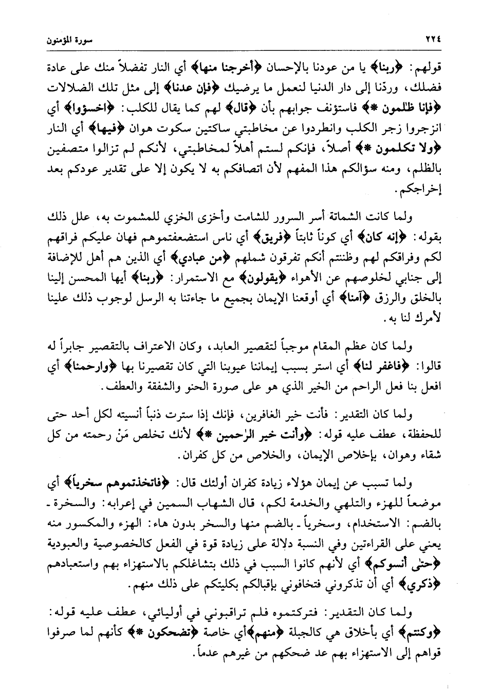قولهم : ( ربنا ( يا من عودنا بالإحسان ) أخرجنا منها ( اي النار تفضلاً منك على عادة فضلك ، وردّنا إلى دار الدنيا لنعمل ما يرضيك ) فإن عدنا ( غلىمثل تلك الضلالات ) فإنا ظالمون ( فاستوئنف جوابهم بأن ) قال ( لهم كما يقال للكلبك ) اخسئووا ) أي انزجروا زجر الكلب وانطردوا عن مخاطبيت ساكتين سكوت هوان ) فيها ) أي النار ) ولا تكلمون ( اصلاً ، فإنكم لستم أهلاً لمخاطبتي ، لأنكم لم تزالوا متصفين بالظلم ، ومنه سؤالكم هذا المفهم لأن اتصافكم به لا يكون إلا على تقدير عودكم بعد إخراجكم .