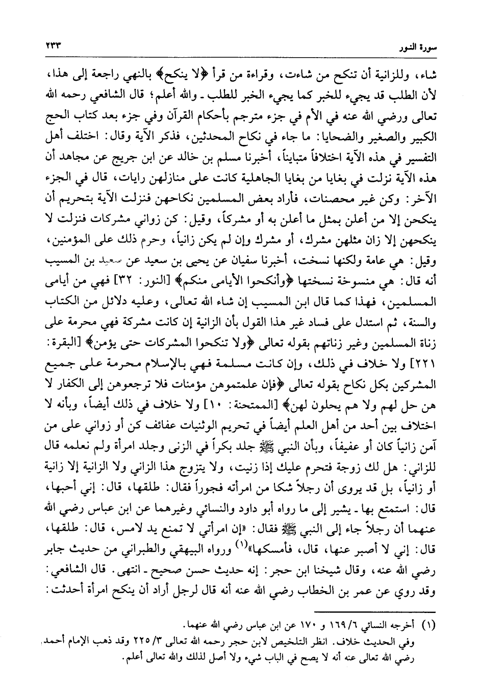 شاء ، وللزانية أن تنكح من شاءت ، وقراءة من قرأ ) لا ينكح ( بالنهي راجعة إلى هذا ، لأن الطلب قد يجيء للخبر كما يجيء الخبر للطلب - والله أعلم ؛ قال الشافعي رحمه الله تعالى ورضي الله عنه في الأم في جزء مترجم بأحكام القرآن وفي جزء بعد كتاب الحج الكبير والصغير والضحايا : ما جاء في نكاح المحدثين ، فذكر الآية وقال : اختلف أهل التفسير في هذه الاية اختلافاً متبايناً ، أخبرنا مسلم بن خالد عن ابن جريج عن مجاهد أن هذه الآية نزلت في بغايا من بغايا الجاهلية كانت على منازلهن رايات ، قال في الجزء الآخر : وكن غير محصنات ، فأراد بعض المسلمين نكاحهن فنزلت الآية بتحريم أن ينكحن إلا من أعلن بمثل ما أعلن به أو مشركاً ، وقيل كن زواني مشركات فنزلت لا ينكحن إلا زان مثلهم مشرك ، أو مشرك وإن لم يكن زانياً ، وحرم ذلك على المؤمنين ، وقيل : هي عامة ولكنها نسختن أخبرنا سفيان بن يحيى بن سعيد عن سعيد بن المسيب أنه قال : هي منسوخة نسختها
