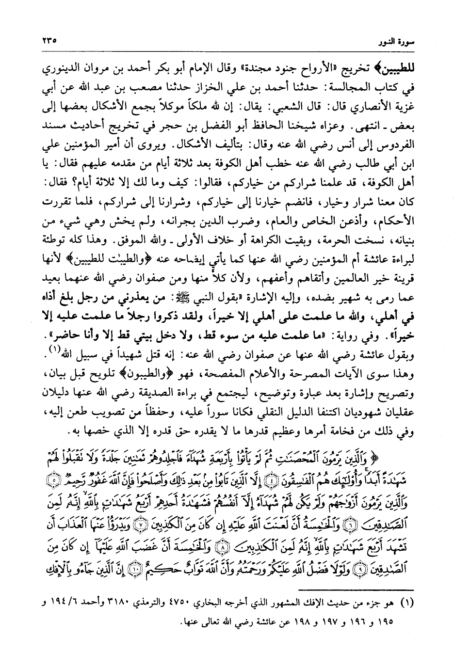 وهذا كله توطئة لبراءة عائشة أم المؤمنين رضي الله عنها كما يأتي إضاحه عنه ) والطيبات للطيبين ( لأنها قرينة خير العالمين وأتقاهم وأعفهم ، ولأن كلاًّ منها ومن صفوان رضي اله عنهما بعيد عما رمى به شهير بضده ، وإليه الإشارة ( بقول النبي ( صلى الله عليه وسلم ) : ( من يعذرني من رجل بلغ أذاه في أهلي ، والله ما علمت على أهلي إلا خيراً ، ولقد ذكروا رجلاً ما علمت عليه إلا خيرا ( وفي رواية ) ما علمت عليه من سوء قط ، ولا دخل بيتي قط إلا وأنا حاضر ( وبقول عائشة رضي الله عنها عن صفان رضي الله عنه : إنه قتل شهيداً في سبيل الله .