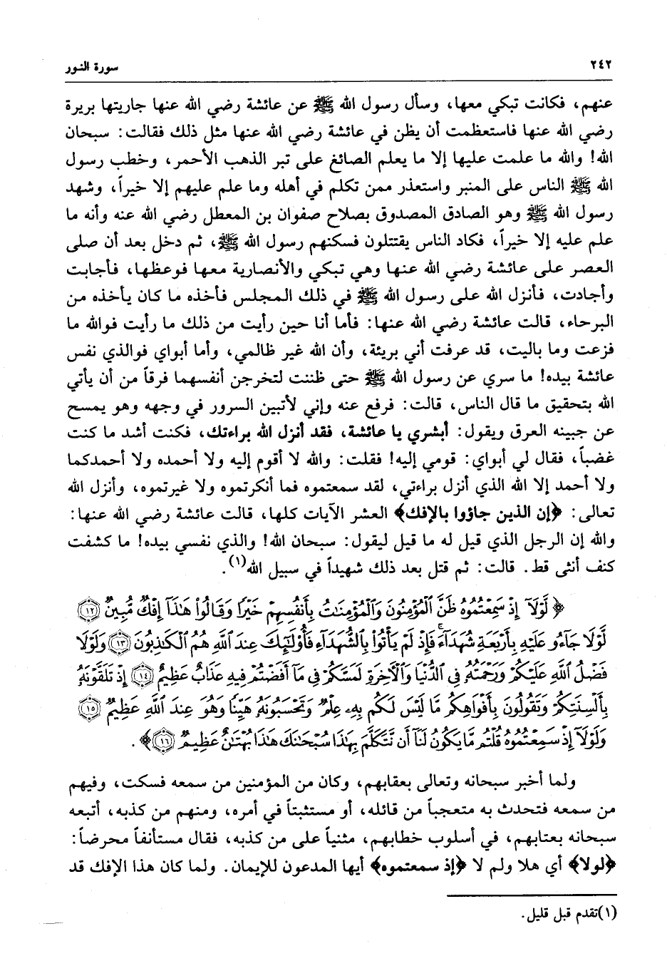 ) لَّوْلا إِذْ سَمِعْتُمُوهُ ظَنَّ الْمُؤْمِنُونَ وَالْمُؤْمِنَاتُ بِأَنْفُسِهِمْ خَيْراً وَقَالُواْ هَذَآ إِفْكٌ مُّبِينٌ لَّوْلاَ جَآءُوا عَلَيْهِ بِأَرْبَعَةِ شُهَدَآءَ فَإِذْ لَمْ يَأْتُواْ بِالشُّهَدَآءِ فَأُوْلَئِكَ عِندَ اللَّهِ هُمُ الْكَاذِبُونَ وَلَوْلاَ فَضْلُ اللَّهِ عَلَيْكُمْ وَرَحْمَتُهُ فِي الدُّنْيَا وَالآخِرَةِ لَمَسَّكُمْ فِي مَآ أَفَضْتُمْ فِيهِ عَذَابٌ عَظِيمٌ إِذْ تَلَقَّوْنَهُ بِأَلْسِنَتِكُمْ وَتَقُولُونَ بِأَفْوَاهِكُمْ مَّا لَّيْسَ لَكُمْ بِهِ عِلْمٌ وَتَحْسَبُونَهُ هَيِّناً وَهُوَ عِندَ اللَّهِ عَظِيمٌ وَلَوْلا إِذْ سَمِعْتُمُوهُ قُلْتُمْ مَّا يَكُونُ لَنَآ أَن نَّتَكَلَّمَ بِهَذَا سُبْحَانَكَ هَذَا بُهْتَانٌ عَظِيمٌ ( ( )