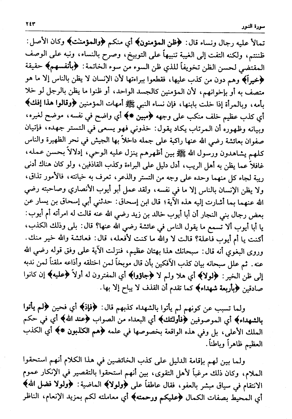 تمالأ عليه رجال ونساء قال : ( ظن المؤمنون ) أي منكم ) والمؤمنات ( وكان الأصل : ظننتم ، ولكنه التفت غلى الغيبة تنبيهاً على التوبيخ ، وصرح بالنساء ، ونبه على الوصف المقتضي لحسن الظن تخويفاً للذي ظن السوء من سوء الخاتمة : ( بأنفسهم ( حقيقة ) خيراً ( وهم دون من كذب عليها ، فقطعوا ببراءتها لأن الإنسان لا يظن بالناس إلا ما هو متصف به أو بإخوانهم ، لأن المؤمنين كالجسد الواحد ، أو ظنوا ما يظن بالرجل لو خلا بأمه ، وبالمرأة إذا خلت بابنها ، فإن نساء النبي ( صلى الله عليه وسلم ) أمهات المؤمنين ) وقالوا هذا إفك ) أي كذب عظيم خلف منكب على وجهه ) مبين ) أي واضح في نفسه ، موضح لغيره ، وبيانه وظهوره أن المرتاب يكاد يقول : خذوني فهو يسعى في التستر جهده ، فإتيان صفوان بعائشة رضي الله عنها راكبة على جملة داخلاً به الجيش في نحر الظهيرة والناس كلهم يشاهدون ورسول الله ( صلى الله عليه وسلم ) بين أظهرهم ينزل عليه الوحي ، إدلالاً بحن عمله ، غافلاً عما يظن به أهل الريب ، أدل دليل على البراءة وكذب القاذفين ، ولو كان هناك أدنى ريبة لجاء كل منهما وحده على وجه من التستر والذعر ، تعرف به خيانته ، فالأمور تذاق ، ولا يظن الإنسان بالناس غلا ما في نفسه ، ولقد عمل أبو أيب الأنصاري وصاحبته رضي الله عنهما بما أشارت إليه هذه الآية ؛ قال ابن اسحاق : حدثني أبي اسحاق بن يسار عن بعض رجال بني النجار أن أبا أيوب خالد بن زيد رضي الله عنه قالت له امرأته أم أيوب : يا أبا أيوب ألا تسمع ما يقول الناس في عائشة رضي الله عنها ؟ قال : بلى وذلك كذب ، أكنت يا أم أيوب فاعلة ؟ قالت لا والله ما كنت لأفعله ، فنزلت الآية على وفق قوله رضي الله عنه .