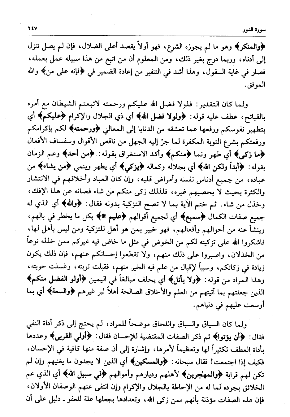 ولما كان السياق والسباق واللحاق موضحاً للمراد ، لم يحتج إلى ذكره أداة النفي فقال : ( أن يؤتوا ( ثم ذكر الصفات المقتضية للإحسان فقال : ( أولي القربى ( وعددها بأداة العطف تكثيراً لها وتعظيماُ لأمرها ، وإشارة إلى أن صفة منها كافية في الإحسان ، فكيف إذا اجتمعت فقال سبحانه : ( والمساكين ) أي الذين لا يجدون ما يغنيهم وإن لم تكن لهم قرابة ) والمهاجرين ( لأهلهم وديارهم وأموالهم ) في سبيل الله ) أي الذي عم الخلائق بجوده لما له من الإحاطة بالجلال والإكرام وإن انتفى عنهم الوصفان الأولان ، فإن هذه الصفات مؤذنة بأنهم ممن زكى الله ، وتعدادها بجعلها علة للعفو - دليل على أن