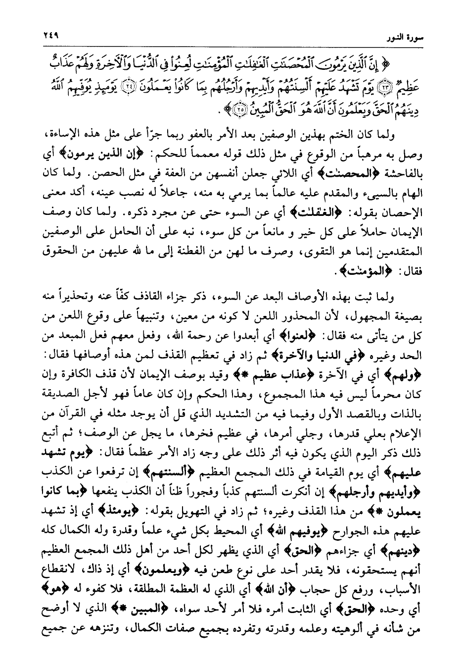 ولما ثبت بهذه الأوصاف البعد عن السوء ، ذكر جزاء القاذف كفّاً عنه وتحذيراً منه بصيغة المجهول ، لأن المحذور اللعن لا كونه المعين ، وتنبيهاً على وقوع اللعن من كل من يأتي منه فقال : ( لعنوا ) أي أبعدوا عن رحمة الله ، وفعل معهم فعل المبعد من الحد وغيره ) في الدنيا والآخرة ( ثم زاد في تعظيم القذف لمن هذه أوصافها فقال : ( ولهم ) أي في الآخرة ) عذاب عظيم ( وقيد بوصف الإيمان لأن قذف الكافرة وإن كان محرماً ليس فيه هذا المجموع ، وهذا الحكم وإن كان عاماً فهو لأجل الصديقة بالذات وبالقصد الأول وفيما فيه من التشديد الذي قل أن يوجد مثله في القرآن من الإعلام بعلي قدرها ، وجلي أمرها ، في عظيم فخرها ، ما يجل عن الوصف ؛ ثم أتبع ذلك ذكر اليوم الذي يكون فيه أثر ذلك على وجه زاد الأمر عظماً فقال : ( يوم تشهد عليهم ( اي يوم القيامة في ذلك المحجمع العظيم ) ألسنتهم ( إن ترفعوا عن الكذب ) وأيديهم وأرجلهم ( إن أنكرت ألسنتهم كذباً وفجوراً ظناً أن الكذب ينفعها ) بما كانوا يعملون ( من هذا القذف وغيره ؛ ثم زاد في التهويل بقوله : ( يومئذ ) أي إذ تشهد عليهم هذه الجوارح ) يوفيهم الله ) أي المحيط بكل شيء علماً وقدرة وله الكمال كله ) دينهم ) أي جزاءهم ) الحق ) أي الذي يظهر لكل أحد من أهل ذلك المجمع العظيم أنهم يستحقونه ، فلا يقدر أحد على نوع طعن فيه ) ويعلمون ) أي إذ ذاك ، لانقطاع الأسباب ، ورفع كل حجاب ) أن الله ) أي الذي له العظمة المطلقة ، فلا كفوء له ) هو ) أي وحده ) الحق ( اي الثابت أمره فلا أمر لأحد سواه ، ) المبين ( الذي لا أوضح من شأنه في ألوهيته وعلمه وقدرته وتفرده بجميع صفات الكمال ، وتنزهه عن جميع