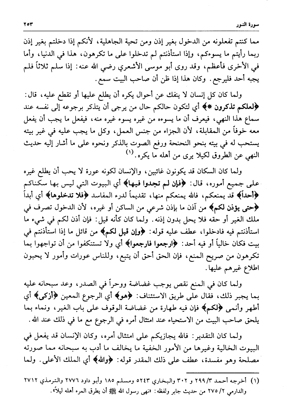 ولما كان كل إنسان لا ينفك عن أحوال يكره أن يطلع عليها أو تقطع عليه ، قال : ( لعلكم تذكرون ( اي لتكون حالكم حال من يرجى أن يتذكر برجوعه غلى نفسه عند سماع هذا النهي ، فيعرف أن ما يسوءه غيره منه ، فيفعل ما يحب أن يفعل معه خوفاً من المقابلة ، لأن الجزاء من جنس العمل ، وكل ما يجب عليه في غير بيته يستحب له في بيته بنحو النحنحة ورفع الصوت بالذكر ونحوه على ما اشار إليه حديث النهي عن الطروق لكيلا يرى من أهله ما يكره .