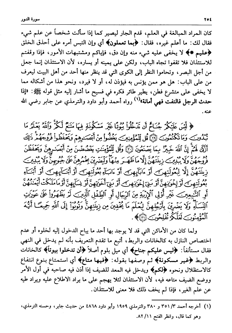 ) لَّيْسَ عَلَيْكُمْ جُنَاحٌ أَن تَدْخُلُواْ بُيُوتاً غَيْرَ مَسْكُونَةٍ فِيهَا مَتَاعٌ لَّكُمْ وَاللَّهُ يَعْلَمُ مَا تُبْدُونَ وَمَا تَكْتُمُونَ قُلْ لِّلْمُؤْمِنِينَ يَغُضُّواْ مِنْ أَبْصَارِهِمْ وَيَحْفَظُواْ فُرُوجَهُمْ ذلِكَ أَزْكَى لَهُمْ إِنَّ اللَّهَ خَبِيرٌ بِمَا يَصْنَعُونَ وَقُل لِّلْمُؤْمِنَاتِ يَغْضُضْنَ مِنْ أَبْصَارِهِنَّ وَيَحْفَظْنَ فُرُوجَهُنَّ وَلاَ يُبْدِينَ زِينَتَهُنَّ إِلاَّ مَا ظَهَرَ مِنْهَا وَلْيَضْرِبْنَ بِخُمُرِهِنَّ عَلَى جُيُوبِهِنَّ وَلاَ يُبْدِينَ زِينَتَهُنَّ إِلاَّ لِبُعُولَتِهِنَّ أَوْ آبَآئِهِنَّ أَوْ آبَآءِ بُعُولَتِهِنَّ أَوْ أَبْنَآئِهِنَّ أَوْ أَبْنَآءِ بُعُولَتِهِنَّ أَوْ إِخْوَانِهِنَّ أَوْ بَنِي إِخْوَانِهِنَّ أَوْ بَنِي أَخَوَاتِهِنَّ أَوْ نِسَآئِهِنَّ أَوْ مَا مَلَكَتْ أَيْمَانُهُنَّ أَوِ التَّابِعِينَ غَيْرِ أُوْلِي الإِرْبَةِ مِنَ الرِّجَالِ أَوِ الطِّفْلِ الَّذِينَ لَمْ يَظْهَرُواْ عَلَى عَوْرَاتِ النِّسَآءِ وَلاَ يَضْرِبْنَ بِأَرْجُلِهِنَّ لِيُعْلَمَ مَا يُخْفِينَ مِن زِينَتِهِنَّ وَتُوبُواْ إِلَى اللَّهِ جَمِيعاً أَيُّهَا الْمُؤْمِنُونَ لَعَلَّكُمْ تُفْلِحُونَ ( ( )