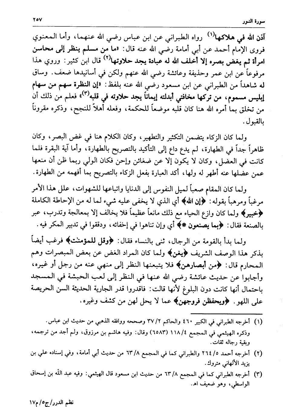 وساق له شاهداص من الطبراني عن ابن مسعود رضي الله عنه بلفظ : ( إن النظرة سهم من سهام إبليس مسموم ، من ترها مخافتي أبدلته إيماناً يجد حلاوته في قلبه ) فعلم من ذلك أن من تخلق بما أمره الله هنا كان قلبه موضعاً للحكمة ، وفعله أهلاً للنجح ، وذكره مقروناً بالقبول .