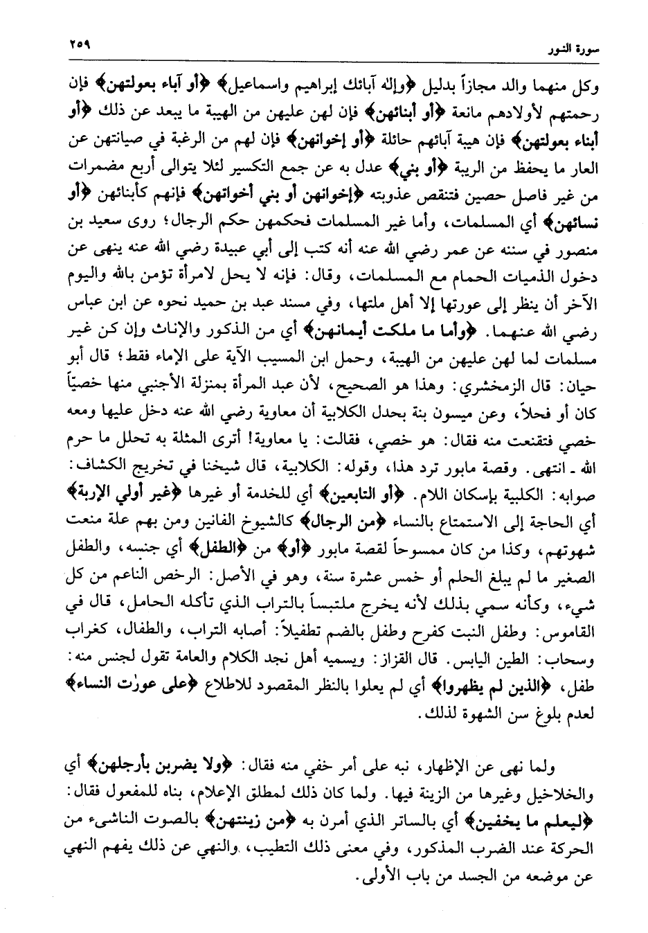 وكل منهما والد مجازاً بدليل ) وإله آبائك إبراهيم واسماعيل ( ) أو آباء بعولتهن ( فإن رحمتهم لأولادهم مانعة ) أو أبنائهن ( فإن لهن عليهن من الهيبة ما يبعد عن ذلك ) أو أبناء بعولتهن ( فإن هيبة آبائهم حائلة ) أو إخوانهن ( فإن لهم من الرغبة في صيانتهن عن العار ما يحفظ من الريبة ) أو بني ( عدل به عن جمع التكسير لئلا يتوالى اربع مضمرات من غير فاصل حصين فتنتقص عذوبته ) إخوانهن أو بني أخوانهن ( فإنهم كأبنائهن ) أو نسائهن ) أي المسلمات ، وأما غير المسلمات فحكمهن حكم الرجال ؛ روى سعيد بن منصور في سننه عن عمر رضي الله عنه أنه كتب إلى عبيدة رضي الله عنه ينهى عن دخول الذميات الحمام مع المسلمات ، وقال : فإنه لا يحل لامرأة تؤمن بالله واليوم الآخر أن ينظر إلى عورتها إلا أهل ملتها ، وفي مسند عبد بن حميد نحوه عن ابن عباس رضي الله عنهما .