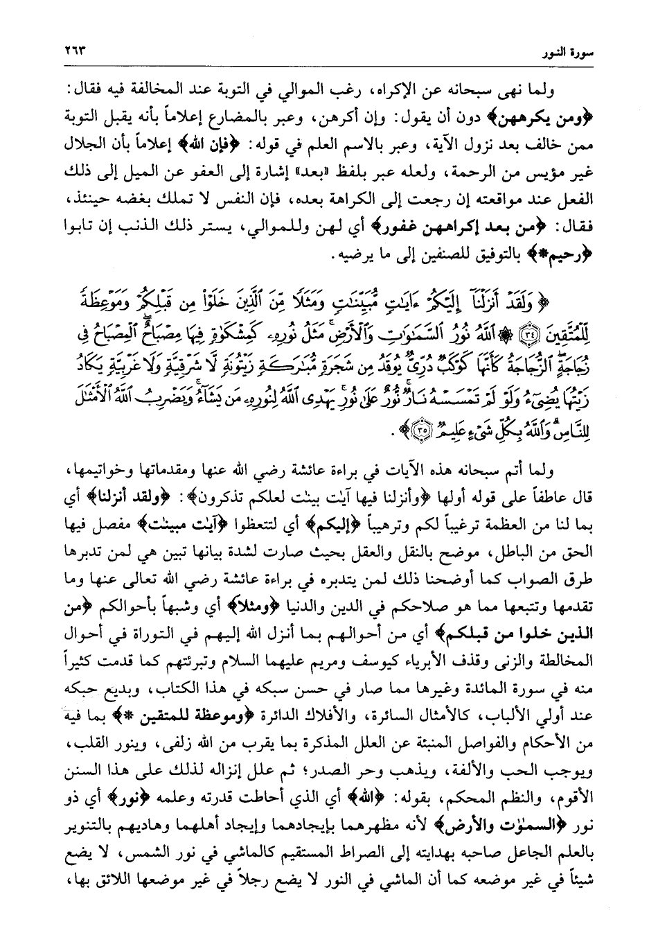 ) وَلَقَدْ أَنْزَلْنَآ إِلَيْكُمْ آيَاتٍ مُّبَيِّنَاتٍ وَمَثَلاً مِّنَ الَّذِينَ خَلَوْاْ مِن قَبْلِكُمْ وَمَوْعِظَةً لِّلْمُتَّقِينَ اللَّهُ نُورُ السَّمَاوَاتِ وَالأَرْضِ مَثَلُ نُورِهِ كَمِشْكَاةٍ فِيهَا مِصْبَاحٌ الْمِصْبَاحُ فِي زُجَاجَةٍ الزُّجَاجَةُ كَأَنَّهَا كَوْكَبٌ دُرِّيٌّ يُوقَدُ مِن شَجَرَةٍ مُّبَارَكَةٍ زَيْتُونَةٍ لاَّ شَرْقِيَّةٍ وَلاَ غَرْبِيَّةٍ يَكَادُ زَيْتُهَا يُضِيءُ وَلَوْ لَمْ تَمْسَسْهُ نَارٌ نُّورٌ عَلَى نُورٍ يَهْدِي اللَّهُ لِنُورِهِ مَن يَشَآءُ وَيَضْرِبُ اللَّهُ الأَمْثَالَ لِلنَّاسِ وَاللَّهُ بِكُلِّ شَيْءٍ عَلَيِمٌ ( ( )
