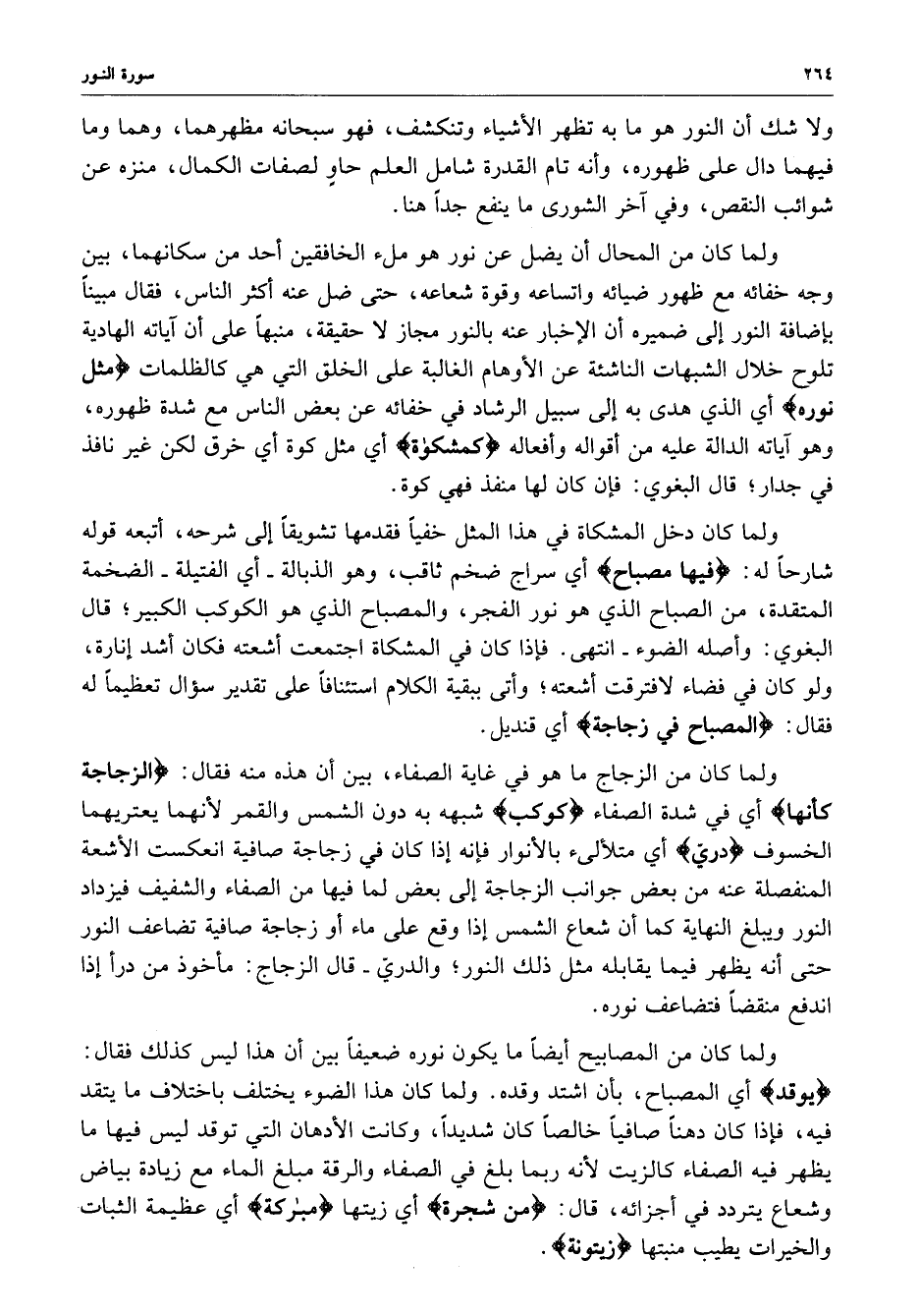 ولا شك أن النورهو ما به تظهر به الأشياء وتنكشف ، فهو سبحانه مظهرها ، وهما وما فيهما دال على ظهوره ، وأنه تام القدرة شامل العم حاوٍ لصفات الكمال ، كنزه عن شوائب النقص ، وفي خر الشورى ما ينفع جداً هنا .
