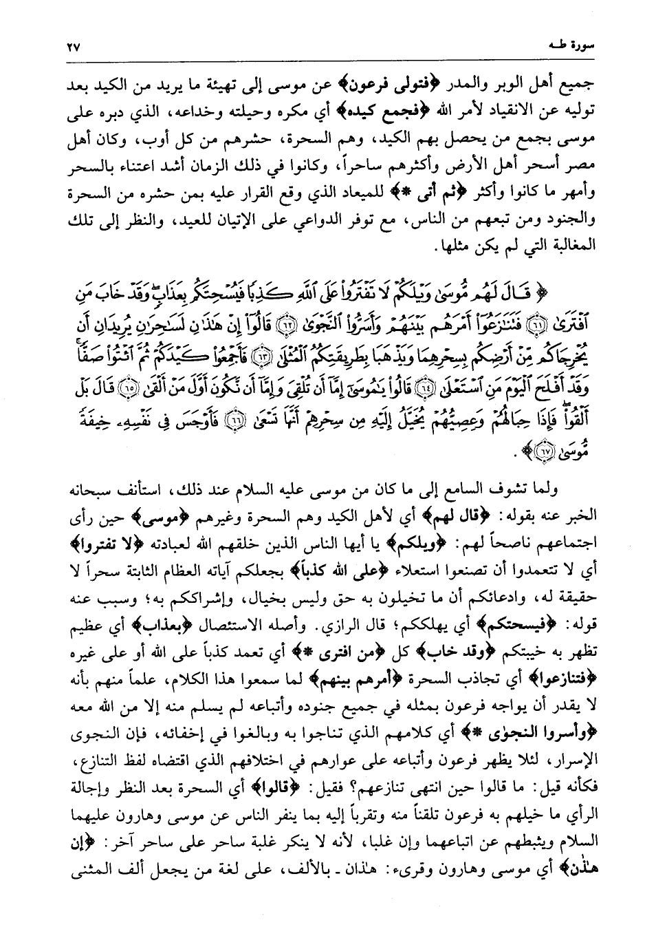 ) قَالَ لَهُمْ مُّوسَى وَيْلَكُمْ لاَ تَفْتَرُواْ عَلَى اللَّهِ كَذِباً فَيُسْحِتَكُم بِعَذَابٍ وَقَدْ خَابَ مَنِ افْتَرَى فَتَنَازَعُواْ أَمْرَهُمْ بَيْنَهُمْ وَأَسَرُّواْ النَّجْوَى قَالُواْ إِنْ هَذَانِ لَسَاحِرَانِ يُرِيدَانِ أَن يُخْرِجَاكُمْ مِّنْ أَرْضِكُمْ بِسِحْرِهِمَا وَيَذْهَبَا بِطَرِيقَتِكُمُ الْمُثْلَى فَأَجْمِعُواْ كَيْدَكُمْ ثُمَّ ائْتُواْ صَفّاً وَقَدْ أَفْلَحَ الْيَوْمَ مَنِ اسْتَعْلَى قَالُواْ يمُوسَى إِمَّآ أَن تُلْقِيَ وَإِمَّآ أَن نَّكُونَ أَوَّلَ مَنْ أَلْقَى قَالَ بَلْ أَلْقُواْ فَإِذَا حِبَالُهُمْ وَعِصِيُّهُمْ يُخَيَّلُ إِلَيْهِ مِن سِحْرِهِمْ أَنَّهَا تَسْعَى فَأَوْجَسَ فِي نَفْسِهِ خِيفَةً مُّوسَى ( ( )