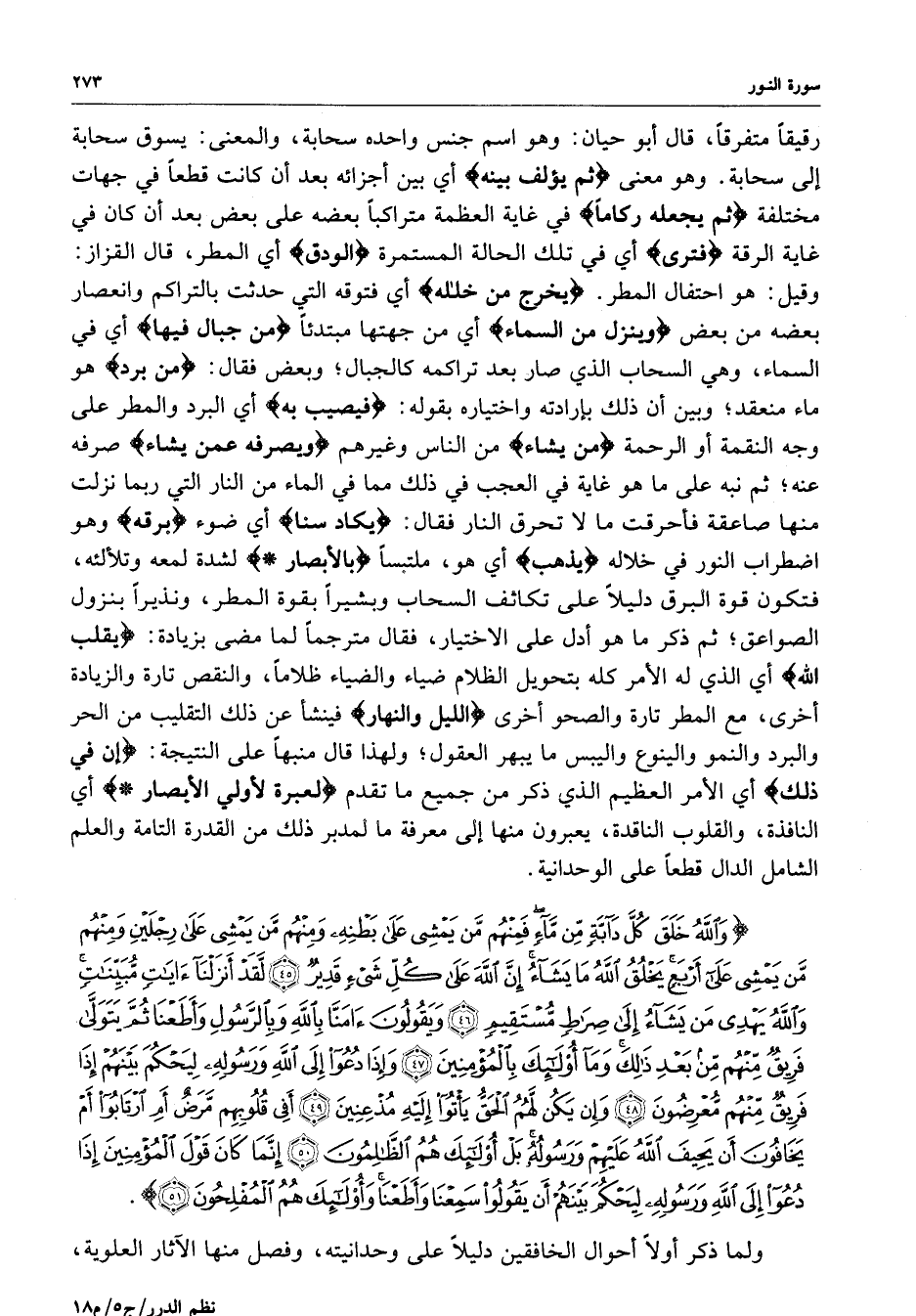) وَاللَّهُ خَلَقَ كُلَّ دَآبَّةٍ مِّن مَّآءٍ فَمِنْهُمْ مَّن يَمْشِي عَلَى بَطْنِهِ وَمِنهُمْ مَّن يَمْشِي عَلَى رِجْلَيْنِ وَمِنْهُمْ مَّن يَمْشِي عَلَى أَرْبَعٍ يَخْلُقُ اللَّهُ مَا يَشَآءُ إِنَّ اللَّهَ عَلَى كُلِّ شَيْءٍ قَدِيرٌ لَّقَدْ أَنزَلْنَآ آيَاتٍ مُّبَيِّنَاتٍ وَاللَّهُ يَهْدِي مَن يَشَآءُ إِلَى صِرَاطٍ مُّسْتَقِيمٍ وَيِقُولُونَ آمَنَّا بِاللَّهِ وَبِالرَّسُولِ وَأَطَعْنَا ثُمَّ يَتَوَلَّى فَرِيقٌ مِّنْهُمْ مِّن بَعْدِ ذلِكَ وَمَآ أُوْلَئِكَ بِالْمُؤْمِنِينَ وَإِذَا دُعُواْ إِلَى اللَّهِ وَرَسُولِهِ لِيَحْكُمَ بَيْنَهُمْ إِذَا فَرِيقٌ مِّنْهُمْ مُّعْرِضُونَ وَإِن يَكُنْ لَّهُمُ الْحَقُّ يَأْتُواْ إِلَيْهِ مُذْعِنِينَ أَفِي قُلُوبِهِمْ مَّرَضٌ أَمِ ارْتَابُواْ أَمْ يَخَافُونَ أَن يَحِيفَ اللَّهُ عَلَيْهِمْ وَرَسُولُهُ بَلْ أُوْلَئِكَ هُمُ الظَّالِمُونَ إِنَّمَا كَانَ قَوْلَ الْمُؤْمِنِينَ إِذَا دُعُواْ إِلَى اللَّهِ وَرَسُولِهِ لِيَحْكُمَ بَيْنَهُمْ أَن يَقُولُواْ سَمِعْنَا وَأَطَعْنَا وَأُوْلَئِكَ هُمُ الْمُفْلِحُونَ ( ( )