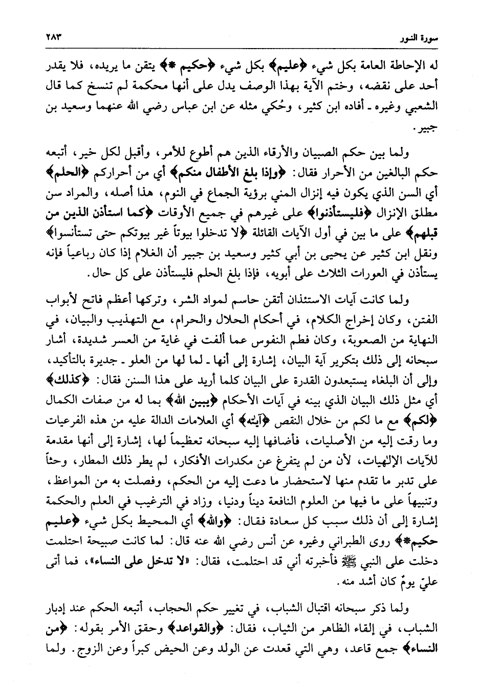 ولما كانت آيات الاستئذان أتقن حاسم لماد الشر ، وتركها أعظم فاتح لأبواب الفتن ، وكان إخراج الكلام ، في أحكام الحلال والحرام ، مع التهذيب والبيان ، في النهاية م الصعوبة ، وكان فطم النفوس عما ألفت في غاية منالعسر شديدة ، أشار سبحانه إلى ذلك بتكرير آية البيان ، إشارة إلى أنها - لما لها من العلو - جديرة بالتأكيد ، وإلى أن البلغاء يستبعدون القدرة على البيان كلما أريد على هذا السنن فقال : ( كذلك ) أي مثل ذلك البيان الذي بينه في آيات الأحكام ) يبين الله ( بما له من صفات الكمال ) لكم ( مع ما لكم من خلال النقص ) آياته ) أي العالمات الدالة عليه من هذه الفرعيات وما رقت إليه الأصليات ، فأضافها إليه سبحانه تعظيماً لها ، إشارة إلى أنها مقدمة للآيات الإلهيات ، لأن من لم يتفرغ منمكدرات الأفكار ، لم يطر ذلك المطار ، وحثاً على تدبر ما تقدم منها لاستحضار ما دعت إليه من الحكم ، وفصلت به من المواعظ ، وتنبيهاً على ما فيها من العلوم النافعة ديناً ودنيا ، وزاد في الترغيب في العلم والحكمة إشارة إلى أن ذلك سبب كل سعادة فقال : ( والله ( اي المحيط بكل شيء ) عليم حكيم ( روى الطبراني وغيره عن أنس رضي الله عنه قال : لما كانت صبيحة احتملت دخلت على النبي ( صلى الله عليه وسلم ) فأخبرته أني قد احتملت ، فقال : ( ا تدخل على النساء ) ، فما أتى عليّ يومٌ كان أشد منه .