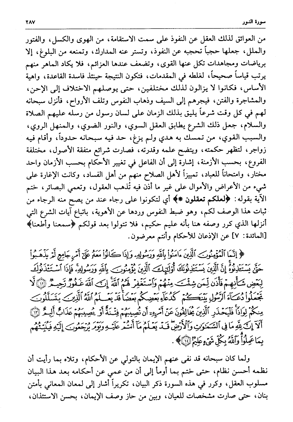 ) إِنَّمَا الْمُؤْمِنُونَ الَّذِينَ آمَنُواْ بِاللَّهِ وَرَسُولِهِ وَإِذَا كَانُواْ مَعَهُ عَلَى أَمْرٍ جَامِعٍ لَّمْ يَذْهَبُواْ حَتَّى يَسْتَأْذِنُوهُ إِنَّ الَّذِينَ يَسْتَأْذِنُونَكَ أُوْلَئِكَ الَّذِينَ يُؤْمِنُونَ بِاللَّهِ وَرَسُولِهِ فَإِذَا اسْتَأْذَنُوكَ لِبَعْضِ شَأْنِهِمْ فَأْذَن لِّمَن شِئْتَ مِنْهُمْ وَاسْتَغْفِرْ لَهُمُ اللَّهَ إِنَّ اللَّهَ غَفُورٌ رَّحِيمٌ لاَّ تَجْعَلُواْ دُعَآءَ الرَّسُولِ بَيْنَكُمْ كَدُعَآءِ بَعْضِكُمْ بَعْضاً قَدْ يَعْلَمُ اللَّهُ الَّذِينَ يَتَسَلَّلُونَ مِنكُمْ لِوَاذاً فَلْيَحْذَرِ الَّذِينَ يُخَالِفُونَ عَنْ أَمْرِهِ أَن تُصِيبَهُمْ فِتْنَةٌ أَوْ يُصِيبَهُمْ عَذَابٌ أَلِيمٌ أَلا إِنَّ للَّهِ مَا فِي السَّمَاوَاتِ وَالأَرْضِ قَدْ يَعْلَمُ مَآ أَنتُمْ عَلَيْهِ وَيَوْمَ يُرْجَعُونَ إِلَيْهِ فَيُنَبِّئُهُمْ بِمَا عَمِلُواْ وَاللَّهُ بِكُلِّ شَيْءٍ عَلِيمُ ( ( )