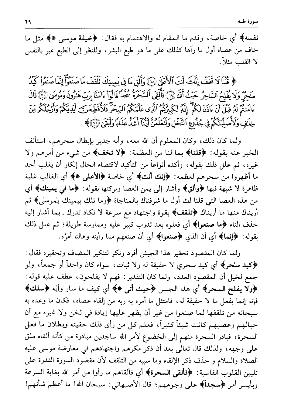 ) قُلْنَا لاَ تَخَفْ إِنَّكَ أَنتَ الأَعْلَى وَأَلْقِ مَا فِي يَمِينِكَ تَلْقَفْ مَا صَنَعُواْ إِنَّمَا صَنَعُواْ كَيْدُ سَاحِرٍ وَلاَ يُفْلِحُ السَّاحِرُ حَيْثُ أَتَى فَأُلْقِيَ السَّحَرَةُ سُجَّداً قَالُواْ آمَنَّا بِرَبِّ هَارُونَ وَمُوسَى قَالَ آمَنتُمْ لَهُ قَبْلَ أَنْ ءَاذَنَ لَكُمْ إِنَّهُ لَكَبِيرُكُمُ الَّذِي عَلَّمَكُمُ السِّحْرَ فَلأُقَطِّعَنَّ أَيْدِيَكُمْ وَأَرْجُلَكُمْ مِّنْ خِلاَفٍ وَلأُصَلِّبَنَّكُمْ فِي جُذُوعِ النَّخْلِ وَلَتَعْلَمُنَّ أَيُّنَآ أَشَدُّ عَذَاباً وَأَبْقَى ( ( )