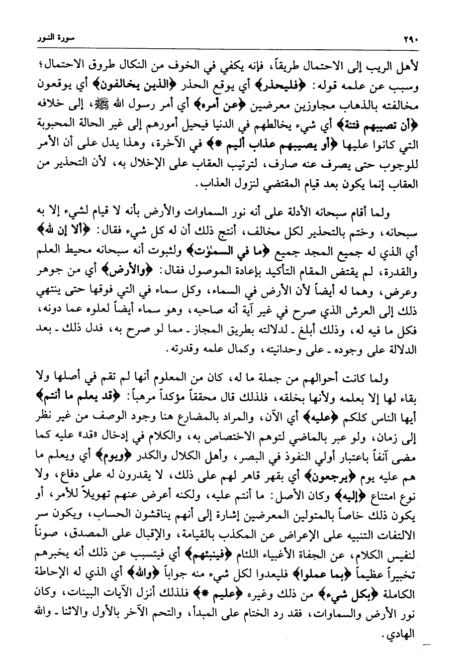 ولما كانت أحوالهم من جملة ما له ، كان من المعلوم أنها لم تقم في أصلها ولا بقاء لها إلا بعلمه ولأنها بخلقه ، فلذلك قال محققاً مؤكداً مرهباً : ( قد يعلم ما أنتم ( أيها الناس كلكم ) عليه ) أي الآن ، والمراد بالمضارع هنا وجود الوصف من غير نظر إلى زمان ، ولو عبر بالماضي لتوهم الاختصاص به ، والكلام في إخال ( قد ) عليه كما مضى آنفاً باعتبار أولي النفوذ في البصر ، وأهل الكلال والكدر ) ويوم ( اي ويعلم ما هم عليه يوم ) يرجعون ( اي بقهر قاهر لهم على ذلك ، لا يقدرون له على دفاع ، ولا نوع امتناع ) إليه ( وكان الأصل : ما أنتم عليه ، ولكنه أعرض عنهم تهويلاً للأمر ، أو يكون ذلك خاصاً بالمتولين المعرضين إشارة إلى أنهم يناقشون الحساب ، ويكون سر الالتفاف التنبيه على الإعراض عن المكذب بالقيامة ، والإقبال على المصدق ، صوناً لنفيس الكلام ، عن الجفاة الأغبياء اللئام ) فينبئهم ) أي فيتسبب عن ذلك أنه يخبرهم تخبيراً عظيماً ) بما عملوا ( فليعدوا لكل شيء منه جواباً ) والله ( اي الذي له الإحاطة الكاملة ) بكل شيء ( من ذلك وغيره ) عليم ( فلذلك أنزل الآيات البينات ، وكان نور الأرض والسماوات ، فقد رد الختام على المبدأ ، والتحم ىلآخر بالأول والاثنا - والله الهادي .