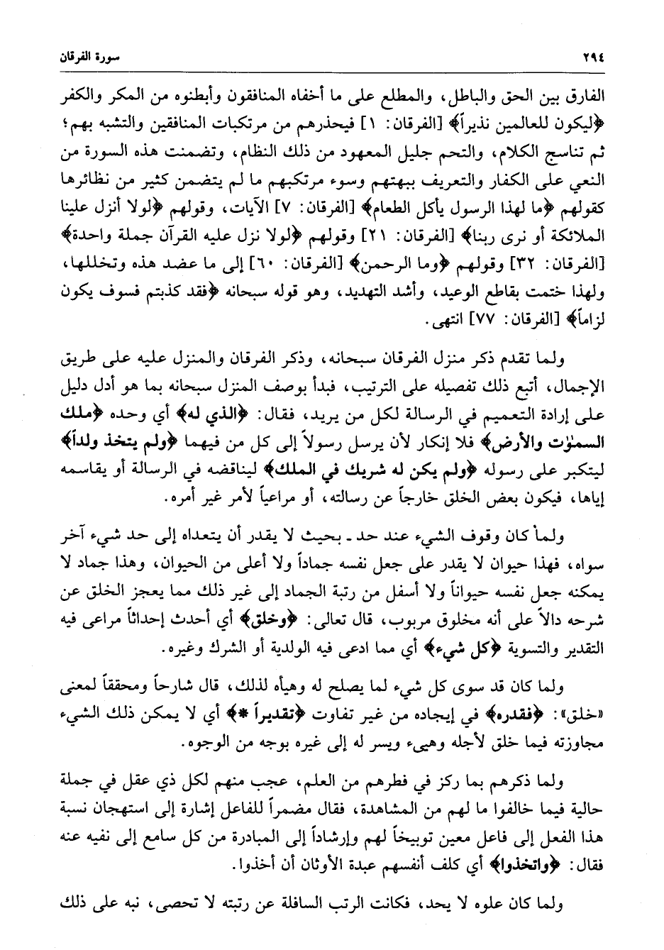 [ الفرقان : 1 ] فيحذرهم من مرتكبات المنافقين والتشبه بهم ؛ ثم تناسخ الكلام ، والتحم جليل المعهد من ذلك النظام ، وتضمنت هذه السورة من النعي على الكفار والتعريف ببهتهم وسوء مرتكبهم ما لم يتضمن كثير من نظائرها كقولهم