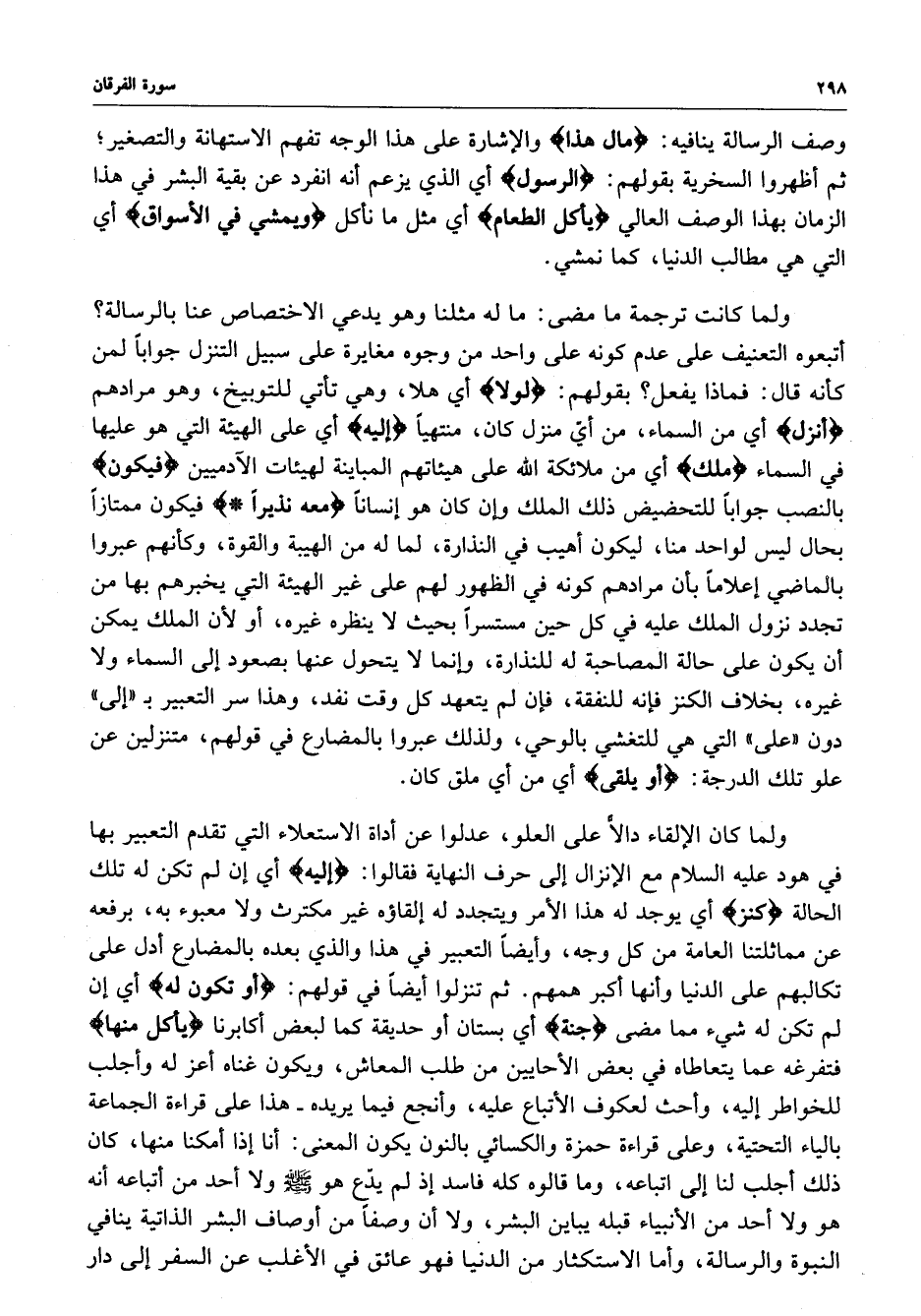 وصف الرسالة ينافيه : ( مال هذا ( والإشارة على هذا الوجه تفهم الاستهانة والتصغير ؛ ثم أظهروا السخرية بقولهم : ( الرسول ) أي الذي يزعم أنه انفرد عن بقية البشر في هذا الزمان بهذا الوصف العالي ) يأكل الطعام ) أي مثل ما نأكل ) ويمشي في الأسواق ) أي التي هي مطالب الدنيا ، كما نمشي .