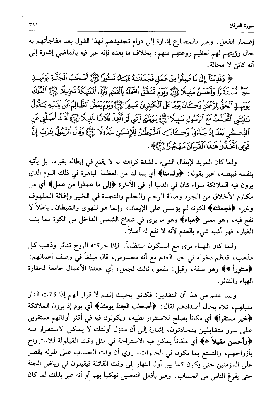 ) وَقَدِمْنَآ إِلَى مَا عَمِلُواْ مِنْ عَمَلٍ فَجَعَلْنَاهُ هَبَآءً مَّنثُوراً أَصْحَابُ الْجَنَّةِ يَوْمَئِذٍ خَيْرٌ مُّسْتَقَرّاً وَأَحْسَنُ مَقِيلاً وَيَوْمَ تَشَقَّقُ السَّمَآءُ بِالْغَمَامِ وَنُزِّلَ الْمَلاَئِكَةُ تَنزِيلاً الْمُلْكُ يَوْمَئِذٍ الْحَقُّ لِلرَّحْمَنِ وَكَانَ يَوْماً عَلَى الْكَافِرِينَ عَسِيراً وَيَوْمَ يَعَضُّ الظَّالِمُ عَلَى يَدَيْهِ يَقُولُ يلَيْتَنِي اتَّخَذْتُ مَعَ الرَّسُولِ سَبِيلاً يوَيْلَتَا لَيْتَنِي لَمْ أَتَّخِذْ فُلاَناً خَلِيلاً لَّقَدْ أَضَلَّنِي عَنِ الذِّكْرِ بَعْدَ إِذْ جَآءَنِي وَكَانَ الشَّيْطَانُ لِلإِنْسَانِ خَذُولاً وَقَالَ الرَّسُولُ يرَبِّ إِنَّ قَوْمِي اتَّخَذُواْ هَذَا الْقُرْآنَ مَهْجُوراً ( ( )